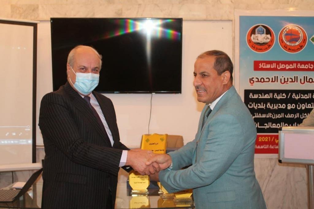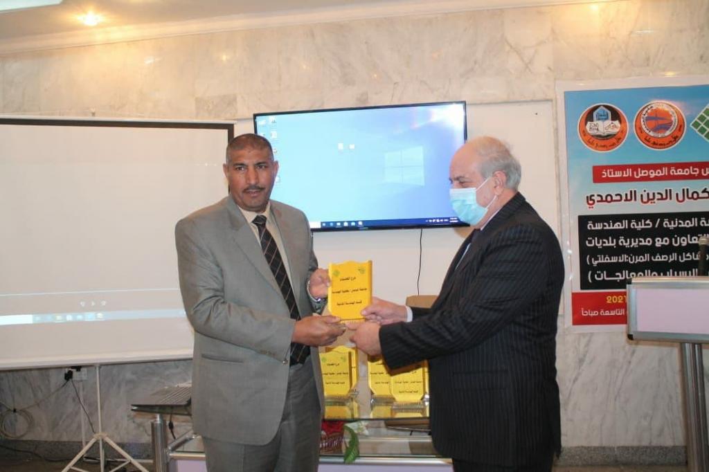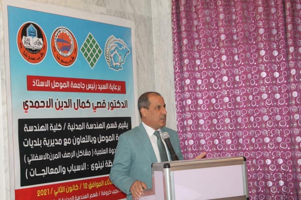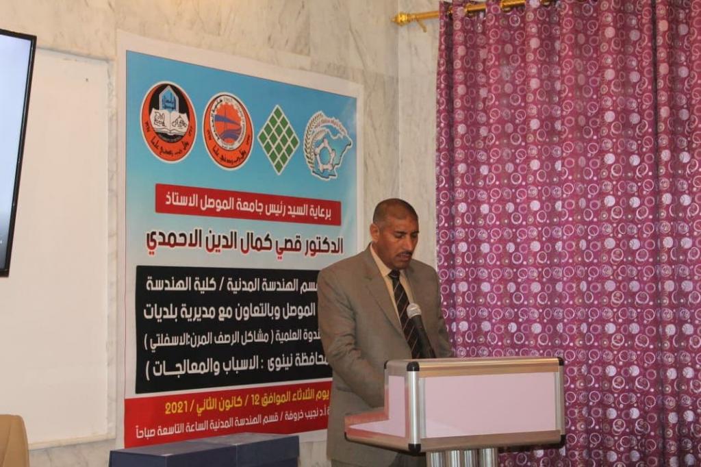 برعاية السيد رئيس جامعة الموصل (الاستاذ الدكتور قصي كمال الدين الأحمدي) المحترم وبحضور السيد عميد كلية الهندسة (الاستاذ الدكتور بيار جعفر السليفاني) المحترم ،والسادة معاون المحافظة لشؤون الإعمار ومدير بلديات محافظة نينوى وممثلي دوائر المحافظة وشركات القطاع الخاص العاملين بالمدينة، أقام قسم الهندسة المدنية / كلية الهندسة ندوته العلمية الأولى للعام الدراسي الحالي اليوم الثلاثاء (12/1/2021) وعلى قاعة (أ.د.نجيب خروفة) في القسم والموسومة ب(مشاكل الرصف الإسفلتي (المرن) في محافظة نينوى الأسباب والمعالجة) وبمشاركة مديرية بلديات نينوى ،تضمنت محاور الندوة إلقاء محاضرات عن أشكال الفشل في الرصف المرن والأسباب الرئيسية للتكسرات في الرصف الإسفلتي بالإضافة الى فوائد المواد المضافة في أعمال الإكساء والصيانة للطرق ،تخلل الندوة توزيع شهادات تقديرية ودروع التميز للمشاركين بالندوة من أساتذة قسم الهندسة المدنية ومهندسي دوائر محافظة نينوى .