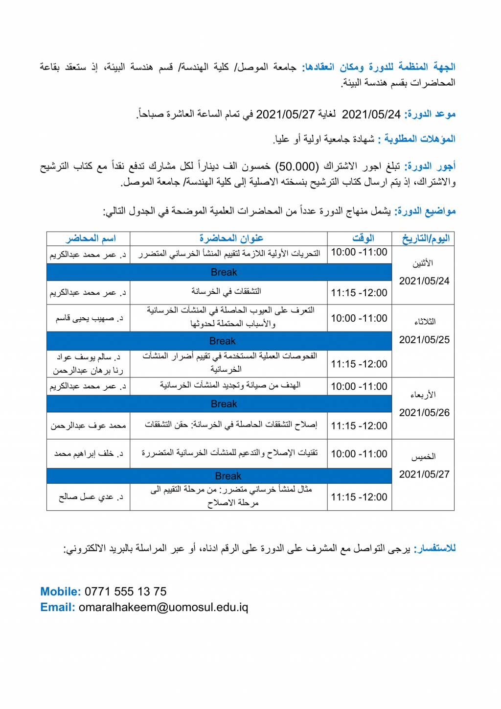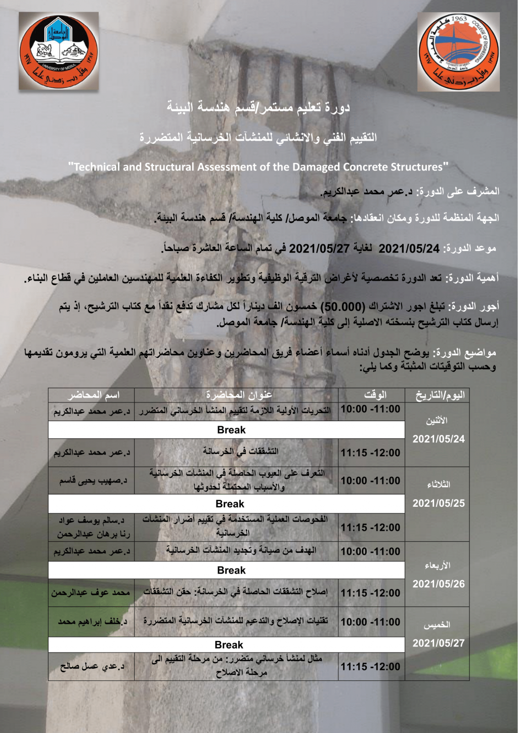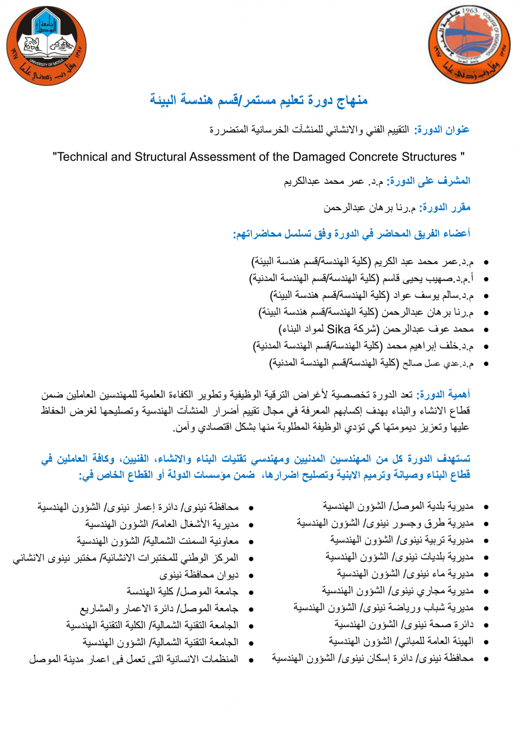 يقيم قسم هندسة البيئة في كلية الهندسة دورة تعليم مستمر بعنوان(التقييم الفني والانشائي للمنشات الخرسانية المتضررة – Technical and Structural Assessment of the Damaged Concrete Structures )يديرها ويحاضر فيها الدكتور عمر محمد عبد الكريم وذلك للمدة 24-27/ايار/2021.وهي دورة تخصصية لأغراض الترقية الوظيفية وتطوير الكفاءة العلمية للمهندسين العاملين ضمن قطاع الانشاء والبناء بهدف إكسابهم المعرفة في مجال تقييم اضرار المنشات الهندسية وتصليحها لغرض الحفاظ عليها وتعزيز ديمومتها لتؤدي الوظيفة المطلوبة منها بشكل اقتصادي وآمن.