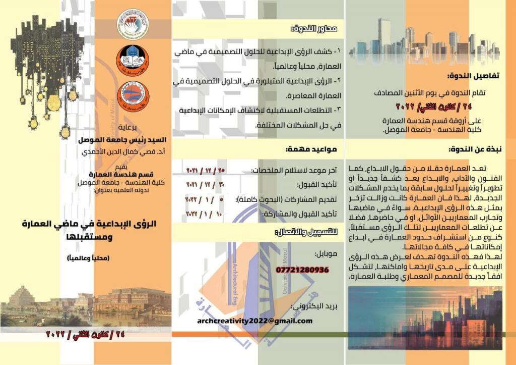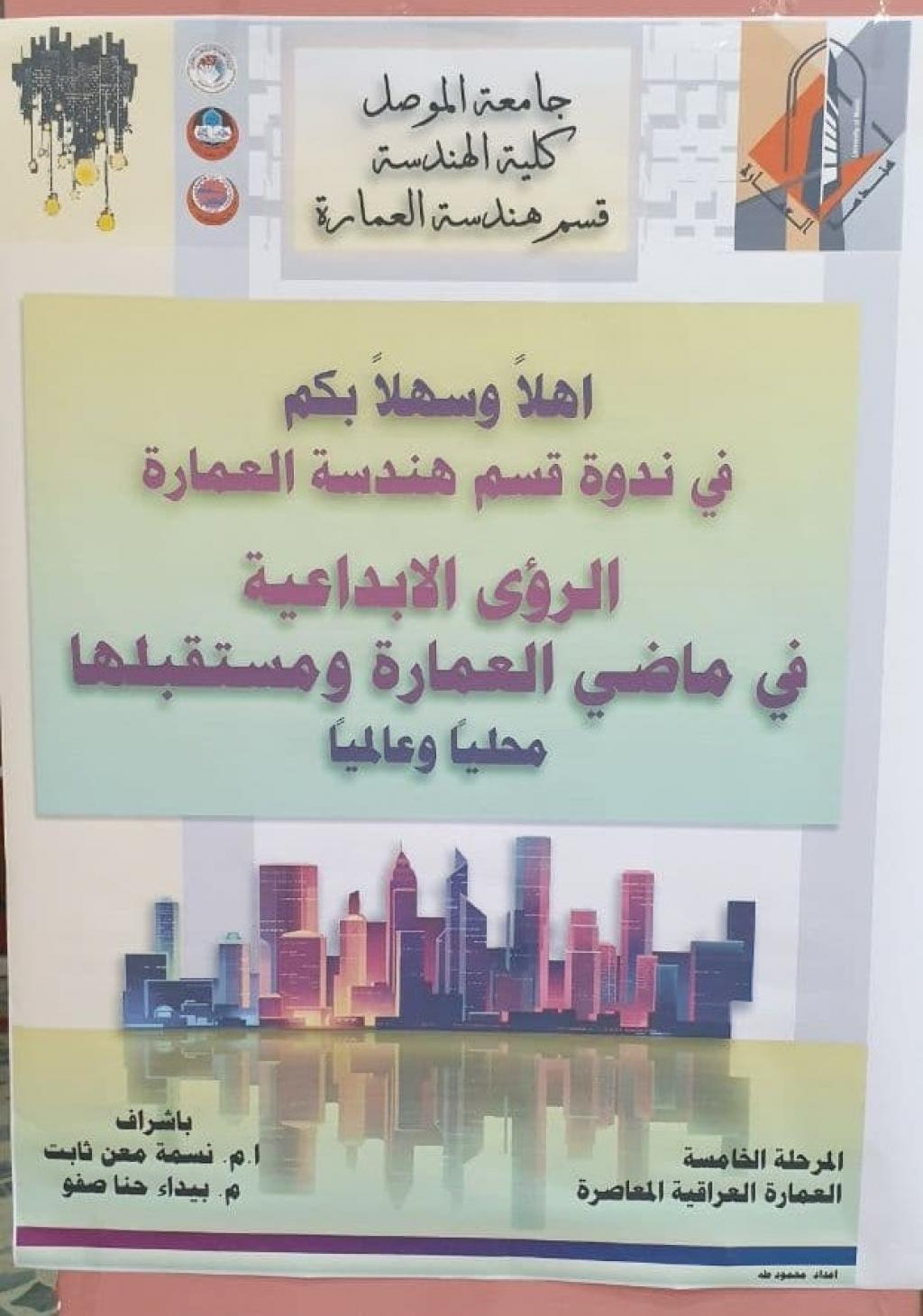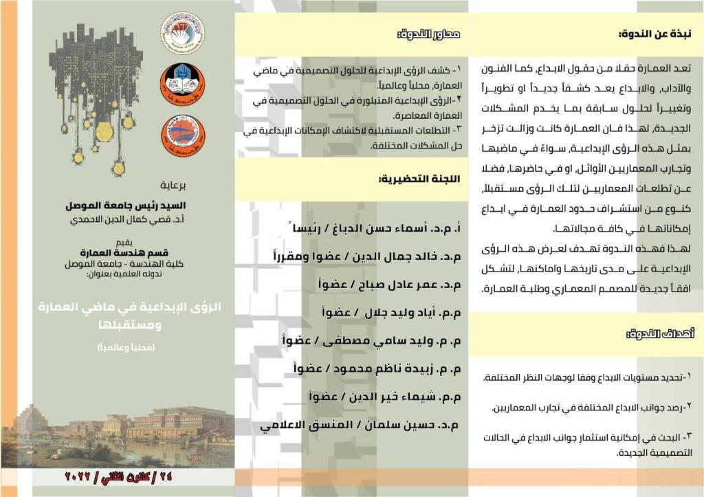 برعاية وحضور الاستاذ الدكتور قصي الاحمدي رئيس جامعة الموصل أقام قسم هندسة العمارة بكلية الهندسة ندوته العلمية الموسومة (الرؤى الإبداعية في ماضي العمارة ومستقبلها) يوم الاثنين الموافق ٢٤ كانون الثاني ٢٠٢٢، حضرها الأستاذ الدكتور بيار جعفر السليفاني عميد الكلية وعدد من السادة اعضاء مجلس الجامعة والهيئة التدريسية في الكلية وشخصيات من المدينة استهلت اعمالها بكلمة للسيد رئيس قسم هندسة العمارة الاستاذ المساعد مقدام امين.هدفت الندوة الى تحديد مستويات الابداع وفقا لوجهات النظر المختلفة ورصد جوانب الابداع في تجارب المعماريين والبحث في امكانية استثماره في الحالات التصميمية الجديدة.تضمنت محاور الندوة كشف الرؤى الإبداعية للحلول التصميمية في ماضي العمارة محليا وعالميا وعرضاً لجوانب ومستويات الإبداع المختلفة في تجارب المعماريين فضلاً عن التطلعات المستقبلية لاكتشاف الامكانات والاساليب الإبداعية في حل المشكلات المختلفة في التصاميم المعمارية.