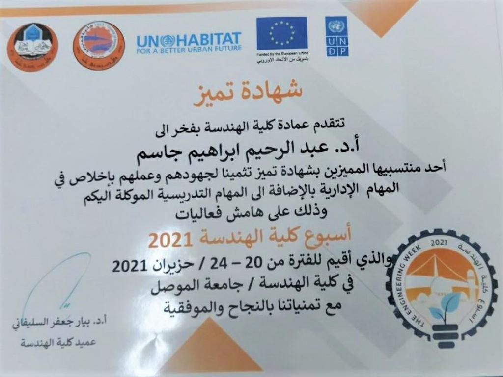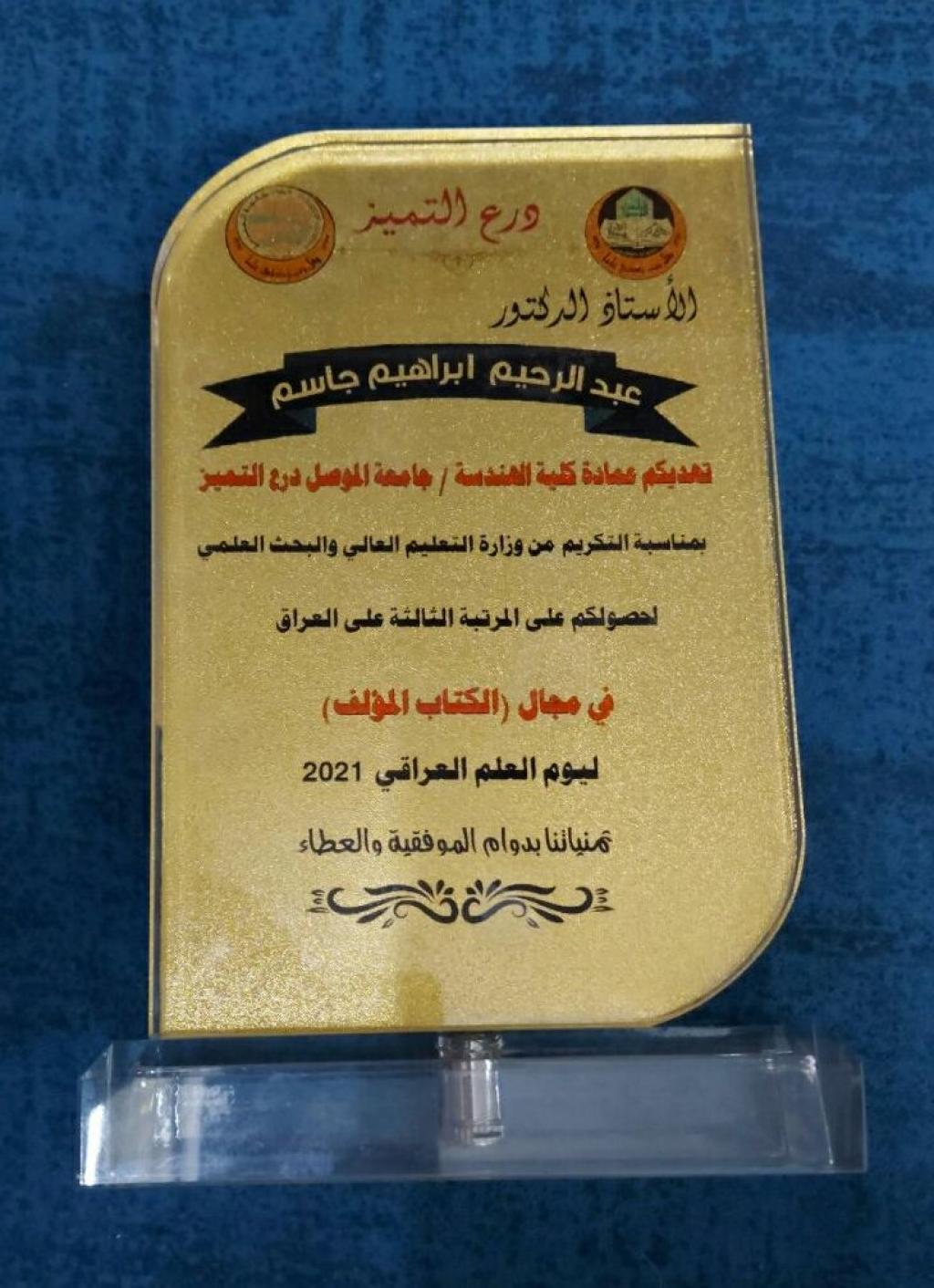 جرى صباح يوم الخميس الموافق 2021/6/24 وضمن فعاليات اسبوع كلية الهندسة تكريم الاستاذ الدكتور عبد الرحيم ابراهيم جاسم عضو الهيئة التدريسية ورئيس قسم الهندسة المدنية بدرع وشهادة التميز لمناسبة حصوله على المرتبة الثالثة على العراق في مجال (الكتاب المؤلف) في يوم العلم العراقي، وقد تخلل اجواء التكريم الإشادة من قبل السيد عميد كلية الهندسة الاستاذ الدكتور بيار جعفر السليڤاني بجهوده التي بذلها واخلاصه في المهام الإدارية المقدمة من قبله متمنيا له التوفيق والمزيد من العطاء العلمي.