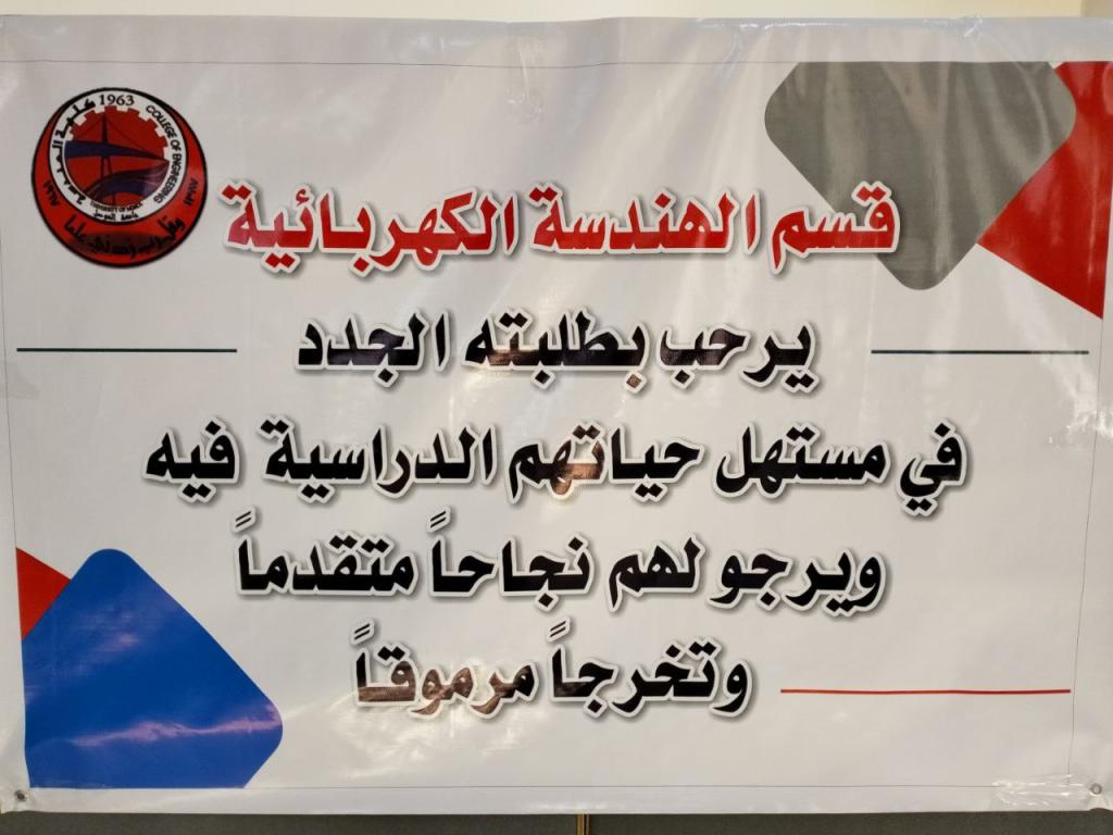 عقد يوم الاثنين الموافق 28/11/2022 لقاء ترحيبي مع الطلبة المقبولين الجدد في قسم الهندسة الكهربائية للعام الدراسي 2023-2022 وعلى قاعة الخوارزمي في كلية هندسة الألكترونيات / جامعة نينوى.كان لقاء السيد رئيس القسم والسيد مسجل الكلية والسيد المقرر مع الطلبة للتعريف بالقسم والكادر التدريسي والإداري والنظام الدراسي وآلية الدوام للعام الحالي والتنبيه لضرورة اتباع التعليمات الصادرة من عمادة الكلية والقسم.