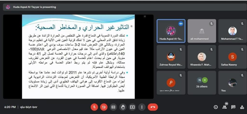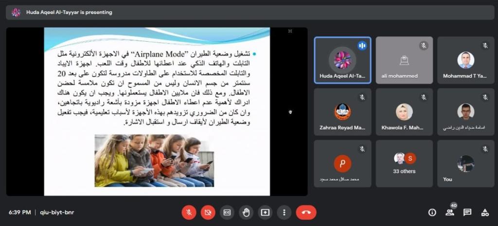 ضمن النشاطات العلمية لقسم الهندسة الكهربائية وبرعاية السيد رئيس جامعة الموصل الاستاذ الدكتور قصي كمال الدين الأحمدي وبأشراف السيد عميد كلية الهندسة الاستاذ الدكتور عبد الرحيم ابراهيم جاسم وبالتعاون مع لجنة تمكين المرأة في كلية الهندسة ووحدة تمكين المرأة في رئاسة الجامعة اقام قسم الهندسة الكهربائية محاضرة الكترونية بعنوان “تأثيرات إشعاع الهاتف المحمول على الصحة” في يوم الأثنين الموافق 2023/1/9 عبر منصة Google meet في الساعة السادسة مساءا.تم التطرق الى تأثيرات الهاتف المحمول على الصحة وتأثير الأشعاعات المنبعثة من الهواتف المتنقلة على صحة الانسان وتأثيرات الاشعاع على انسجة جسم البالغين وتبيان خطورتها على دماغ الطفل بشكل خاص.حاضر فيها التدريسيات من قسم الهندسة الكهربائية م.م. هدى عقيل أحمد الطيار وم.م. نغم حكمت عزيز وم.م. مها عبد الرحمن فليح.