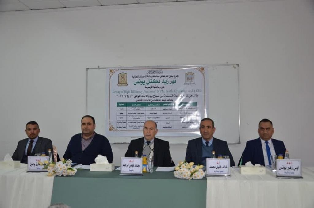 شارك الاستاذ المساعد الدكتور محمد طارق ياسين التدريسي في قسم الهندسة الكهربائية – كلية الهندسة – جامعة الموصل، في لجنة مناقشة رسالة الماجستير للطالبة نور زيد نكتل كلية هندسة الالكترونيات جامعة نينوى والموسومة “تصميم مركب التردد الكسري عالي الجودة بتردد 2.4 كيكاهيرتز”.