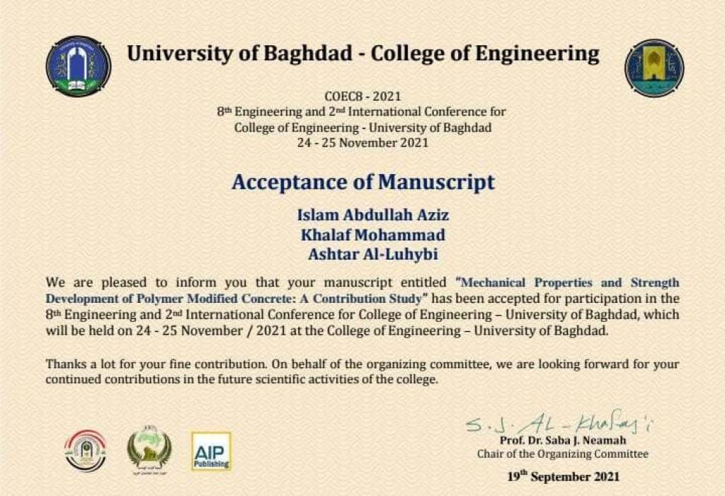 ضمن النشاط العلمي لأعضاء الهيئة التدريسية لكلية الهندسة في جامعة الموصل، شارك م.م. اسلام عبدالله عزيز في المؤتمر الهندسي الثامن والدولي الثاني لكلية الهندسة / جامعة بغداد والمقام على رحاب الجامعة وللفترة 24-25/11/2021 وبنشر والقاء بحثه الموسوم (Mechanical Properties and Strength Development of Polymer Modified Concrete: A Contribution Study) وهو بحث مشترك مع كلا من م.د. خلف ابراهيم محمد وم. عشتار صالح حيث تم عرض العديد من البحوث المقدمة من داخل وخارج القطر وبمختلف الاختصاصات الهندسية والتي سيتم نشرها في (AIP Conference Proceedings) وهي جهة نشر معتمدة ومصنفة ضمن مستوعبات سكوبس.