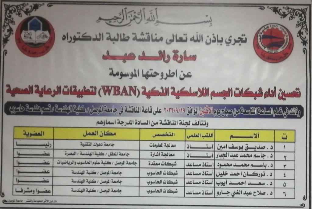 تمت مناقشة أطروحة دكتوراة في قسم هندسة الحاسوب بجامعة الموصل بعنوان “تحسين أداء شبكات الجسم اللاسلكية الذكية (WBAN) لتطبيقات الرعاية الصحية” للطالبة سارة رائد عبد في تمام الساعة التاسعة من يوم الإثنين الموافق 19/9/2022 وعلى قاعة المناقشات في قسم هندسة الميكاترونكس.