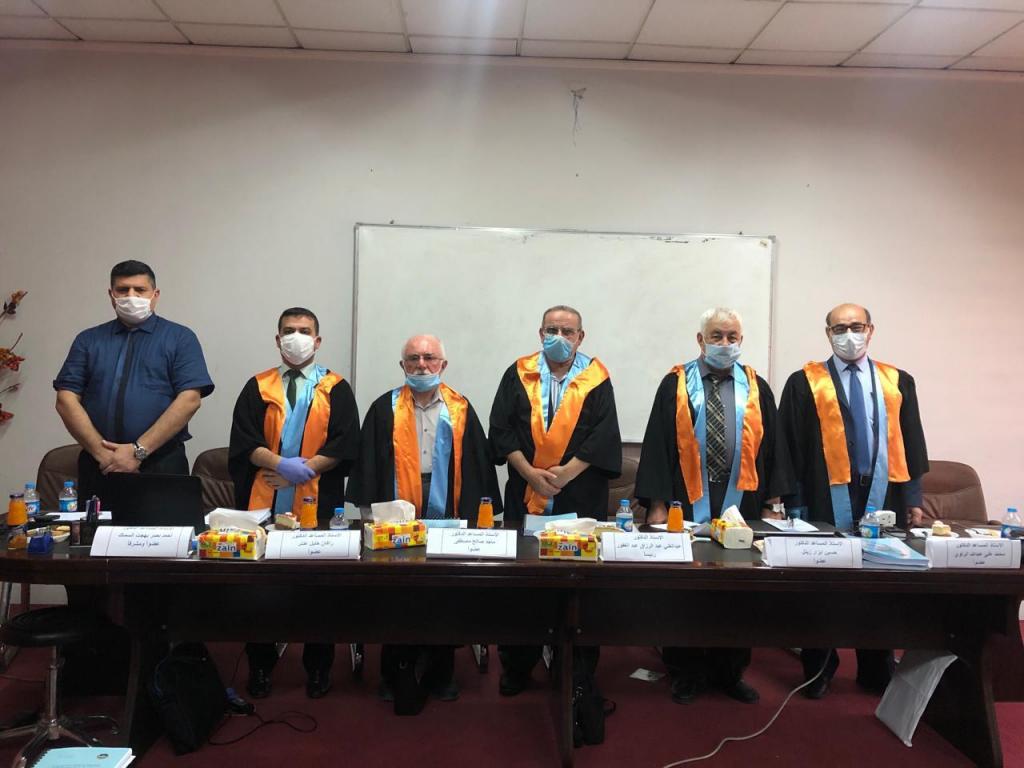 وقد تألفت لجنة المناقشة من أ.د. عبد الغني عبد الرزاق عبد الغفور رئيسا وعضوية كل من أ.م.د ماجد صالح مصطفى عضوا و أ.م.د حسين ابزار زينل عضوا وأ.م.د محمد علي عبدالله الراوي عضوا و أ.م.د راكان خليل عنترعضوا و أ.م.د احمد نصر بهجت السماك عضوا و مشرفا.