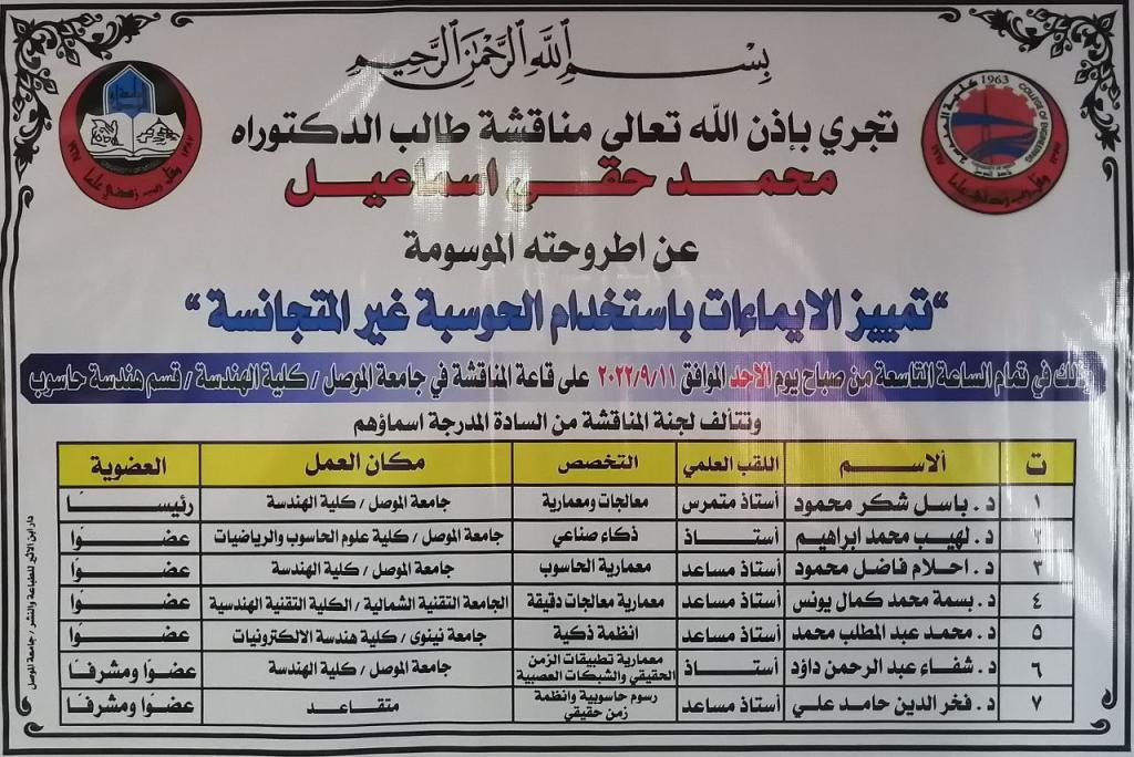 تمت مناقشة أطروحة دكتوراه في قسم هندسة الحاسوب بجامعة الموصل بعنوان “تمييز الايماءات باستخدام الحوسبة غير المتجانسة” للطالب محمد حقي إسماعيل في تمام الساعة التاسعة من يوم الاحد الموافق 11/9/2022 وعلى قاعة المناقشات في قسم هندسة الميكاترونكس.