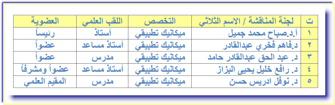 تمت مناقشة رسالة الماجستير للطالب سعد احمد يونس الدباغ فــــي قسم الهندسة الميكانيكية / كلية الهندسة / جامعة الموصل , والموسومة (الاستجابة الهيكلية لوصلة ربط مشفهة والمربوطة بالبراغي تحت تأثير عوامل متعددة) على قاعة المناقشات في القسم بتاريخ 14/3/2013 عند الساعة التاسعة صباحاً وقد كانت لجنة المناقشة مؤلفة من السادة المدرجة أسماؤهم أدناه :
