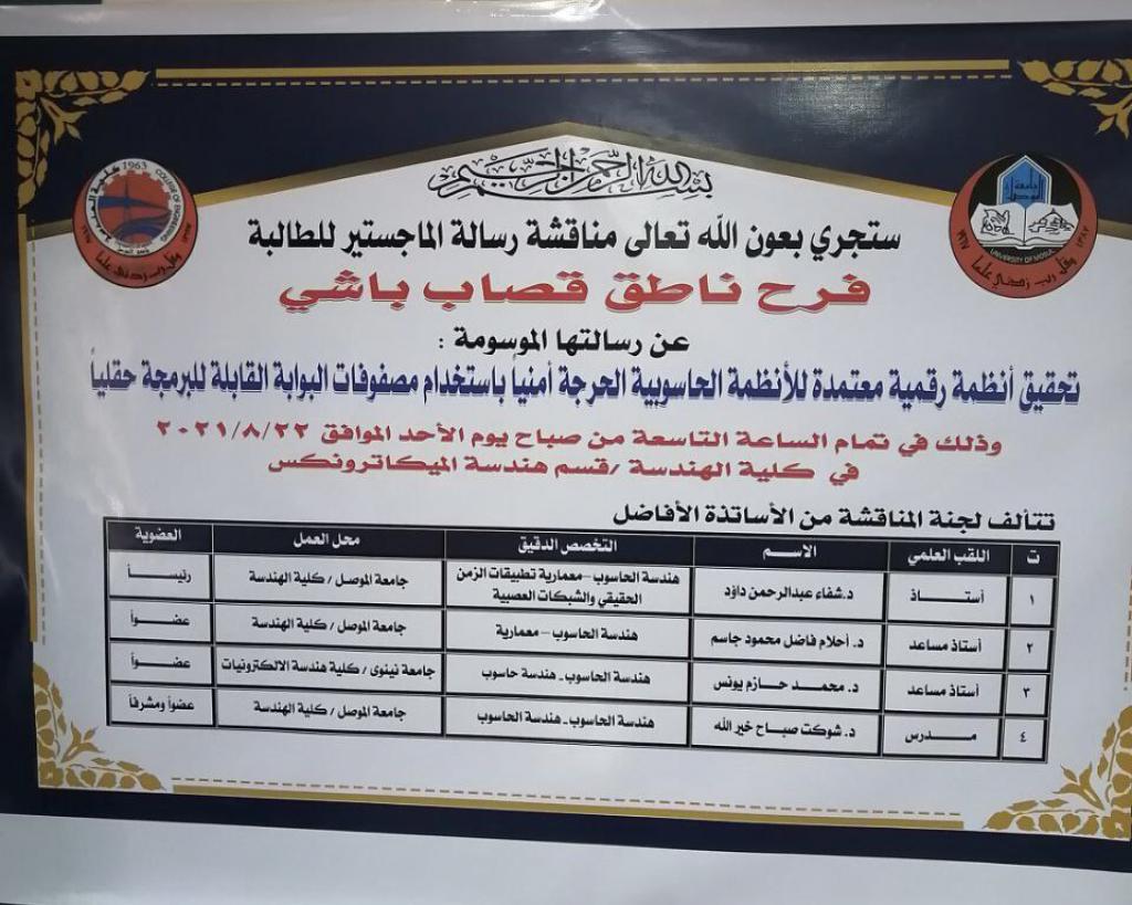 تمت مناقشة رسالة ماجستير في قسم هندسة الحاسوب بجامعة الموصل بعنوان (تحقيق أنظمة رقمية معتمدة للأنظمة الحاسوبية الحرجة أمنيا “باستخدام مصفوفات البوابة القابلة للبرمجة حقليا”) للطالبة فرح ناطق ياسين قصاب باشي في الساعة التاسعة من صباح يوم الاحد الموافق ٢٢-٨-٢٠٢١ في قاعة المناقشة التابعة لقسم هندسة الميكاترونكس. تضمنت الرسالة دراسة العديد من الأنظمة الرقمية القائمة على الأجهزة والتي تم إنشاؤها بناءً على تقنيات تحمل الخطأ (FT) و مصفوفات البوابة القابلة للبرمجة حقليا (FPGAs)، وتحليل الموثوقية. وتم اقتراح نظام رقمي جديد يمكن الاعتماد عليه (DeDS) يتكون من كتل تتحمل الأخطاء (FTBs)، وكتل وظيفية احتياطية (SFBs)، ووحدات التزامن، ووحدات إدخال وإخراج. حيث تم استخدام السلاسل المستندة إلى ماركوف لنمذجة التشغيل الصحيح لنظام الأجهزة المقترح الذي يهدف إلى تحقيقه على التكنولوجيا القائمة على FPGA. صمم هذا النظام ليكون موثوقًا به ضد الأعطال العابرة (TF) والأعطال الدائمة (PF) والأسباب الشائعة لفشل للأجهزة (CCF). استخدمت أداة Mathworks Simulink في نمذجة مكونات الأجهزة للنظام المقترح والتحقق من متطلبات السلامة، وقد تم استخدام أداة التصميم Vivado لتحقيق مكونات الأجهزة للنظام المقترح. تم تحقيق تحليل الموثوقية للنظام باستخدام السلاسل المستندة إلى Markov وبرنامج WinSure / WinStem. علاوة على ذلك، لتسهيل البرمجة، تم الاعتماد على نموذج برمجة كتلة الوظائف مشابهًا للمعيار الدولي “IEC 61131-3”. تم إجراء حقن لأخطاء عابرة ودائمة وشائعة على مستويات مختلفة من النظام المقترح للتحقق من التشغيل الصحيح للمكونات الداخلية للنظام الرقمي المقترح (DeDS). وتمت قراءة قرار لجنة المناقشة بقبول الرسالة مع منح الطالبة درجة الماجستير. تراس اللجنة الاستاذ الدكتور شفاء عبدالرحمن داؤد ومعهم الاستاذ المساعد الدكتور أحلام فاضل محمود عضوا والاستاذ المساعد الدكتور محمد حازم يونس عضوا والمدرس الدكتور شوكت صباح خيرالله عضوا و مشرفا.