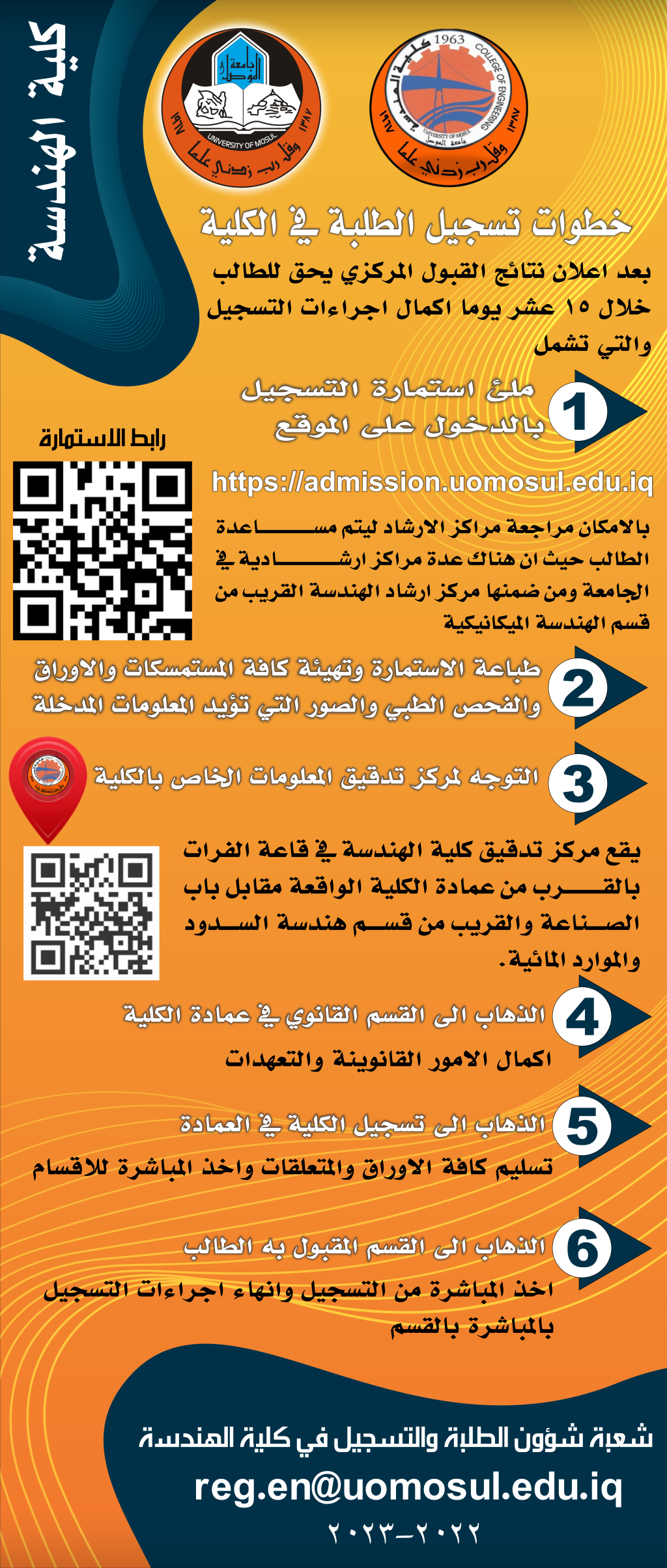 مع ظهور نتائج القبول المركزي في الجامعات والمعاهد العراقية .. تعلن كلية الهندسة في جامعة الموصل بقبول بحدود (882) طالب وطالبة للالتحاق بصفوف الدراسة للعام الدراسي 2022-2023. حيث تتوزع الاعداد على الاقسام العلمية كالتاليتم قبول بحدود (138) طالب وطالبة في قسم الهندسة المدنيةتم قبول بحدود (169) طالب وطالبة في قسم الهندسة الكهربائيةتم قبول بحدود (160) طالب وطالبة في قسم الهندسة الميكانيكيةتم قبول بحدود (122) طالب وطالبة في قسم هندسة السدود والموارد المائيةتم قبول بحدود (85) طالب وطالبة في قسم الهندسة العمارةتم قبول بحدود (90) طالب وطالبة في قسم هندسة الحاسوبتم قبول بحدود (37) طالب وطالبة في قسم هندسة الميكاترونكستم قبول بحدود (81) طالب وطالبة في قسم هندسة البيئة.تبارك وترحب كوادر كلية الهندسة بطلبتها الجدد وتدعوهم لاتباع الخطوات المرفقة بالصورة لاتمام عملية التسجيل والبدء بالدراسة. متمنين لهم حياة دراسية زاخرة بالتعلم والرقي العلمي وبما يتناسب مع مستوى الكلية العلمي المشهود.
