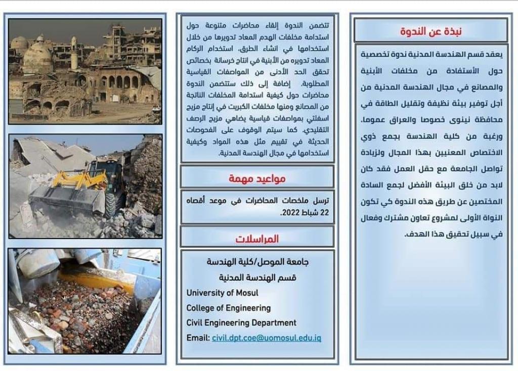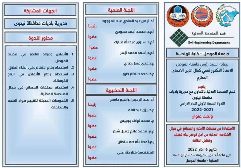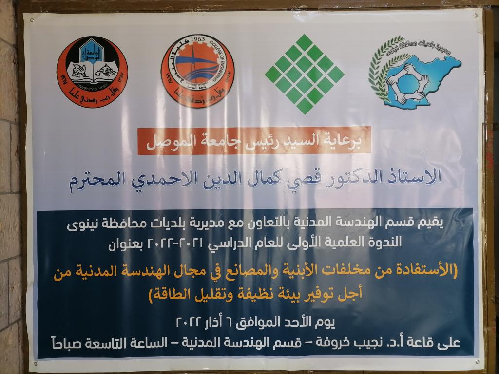 برعاية السيد رئيس جامعة الموصل الاستاذ الدكتور قصي كمال الدين الاحمدي المحترم، شهد قسم الهندسة المدنية في جامعة الموصل إقامة الندوة الحضورية العلمية الاولى للعام الدراسي 2021 – 2022 وبالتعاون مع مديرية بلديات محافظة نينوى وبعنوان “الاستفادة من مخلفات الابنية والمصانع في مجال الهندسة المدنية من اجل توفير بيئة نظيفة وتقليل الطاقة”. حيث أقيمت في اروقة قسم الهندسة المدنية وتحديدا في قاعة الاستاذ الدكتور نجيب خروفة يوم الاحد 6 اذار 2022.