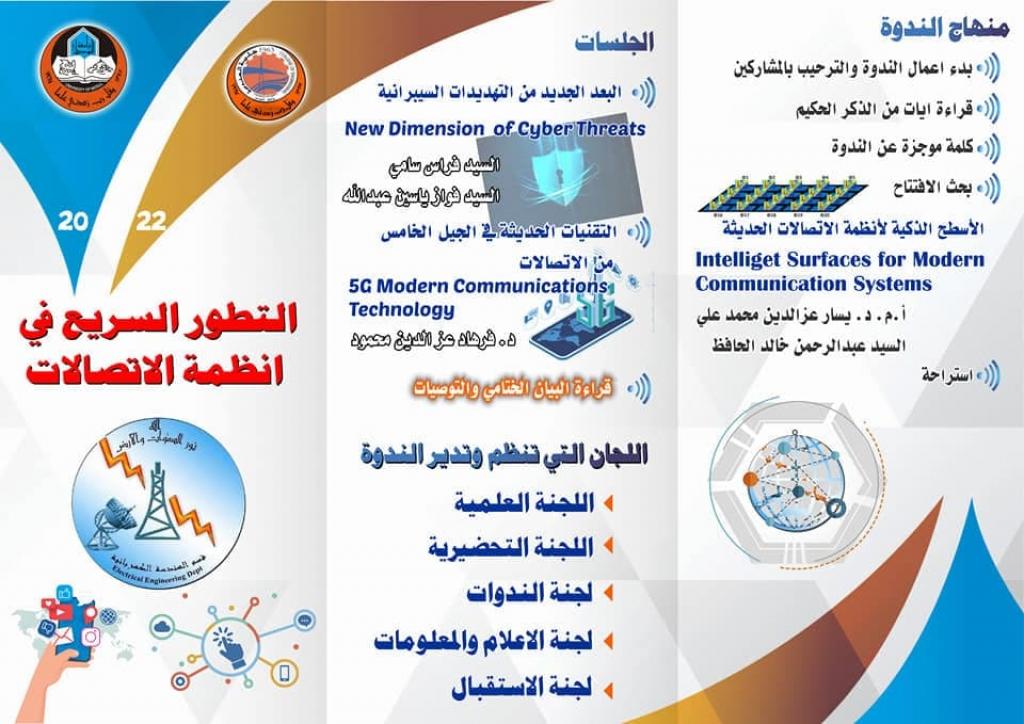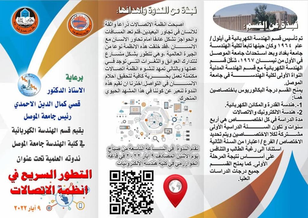 برعاية الاستاذ الدكتور قصي كمال الدين الاحمدي رئيس جامعة الموصل، اقام قسم الهندسة الكهربائية ندوة علمية بعنوان (التطور السريع في انظمة الاتصالات) في الساعة التاسعة من صباح يوم الاثنين الموافق 9-5-2022 وعلى قاعة الخوارزمي. حيث تشرفت ادارة القسم المتمثلة برئيس القسم الاستاذ المساعد الدكتور محمد طارق ياسين بأستقبال عميد كلية الهندسة الدكتور عمر موفق المحترم وعميد كلية هندسة الالكترونيات الاستاذ الدكتور خالد خليل المحترم ومعاون العميد للشؤون الادارية لكلية الهندسة الاستاذ عمر تراث توفيق المحترم ورؤساء الاقسام المحترمون والحضور الكرام.