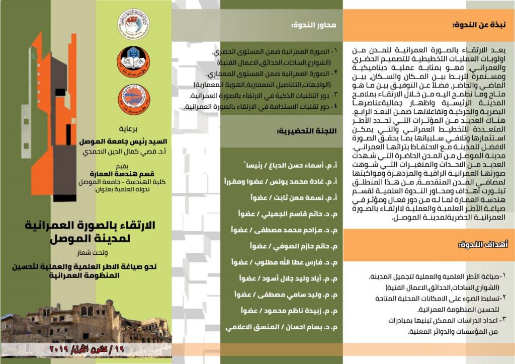 برعاية الاستاذ الدكتور قصي كمال الدين الاحمدي رئيس جامعة الموصل وتحت شعار “نحو صياغة الاطر العلمية والعملية لتحسين المنظومة العمرانية” يقيم قسم هندسة العمارة وعلى اروقته يوم الخميس الموافق ١٩ كانون الاول للعام ٢٠١٩ ندوة علمية تحت عنوان “الارتقاء بالصورة العمرانية لمدينة الموصل”. تشتمل هذه الندوة على محاور اربعة وكما يلي: