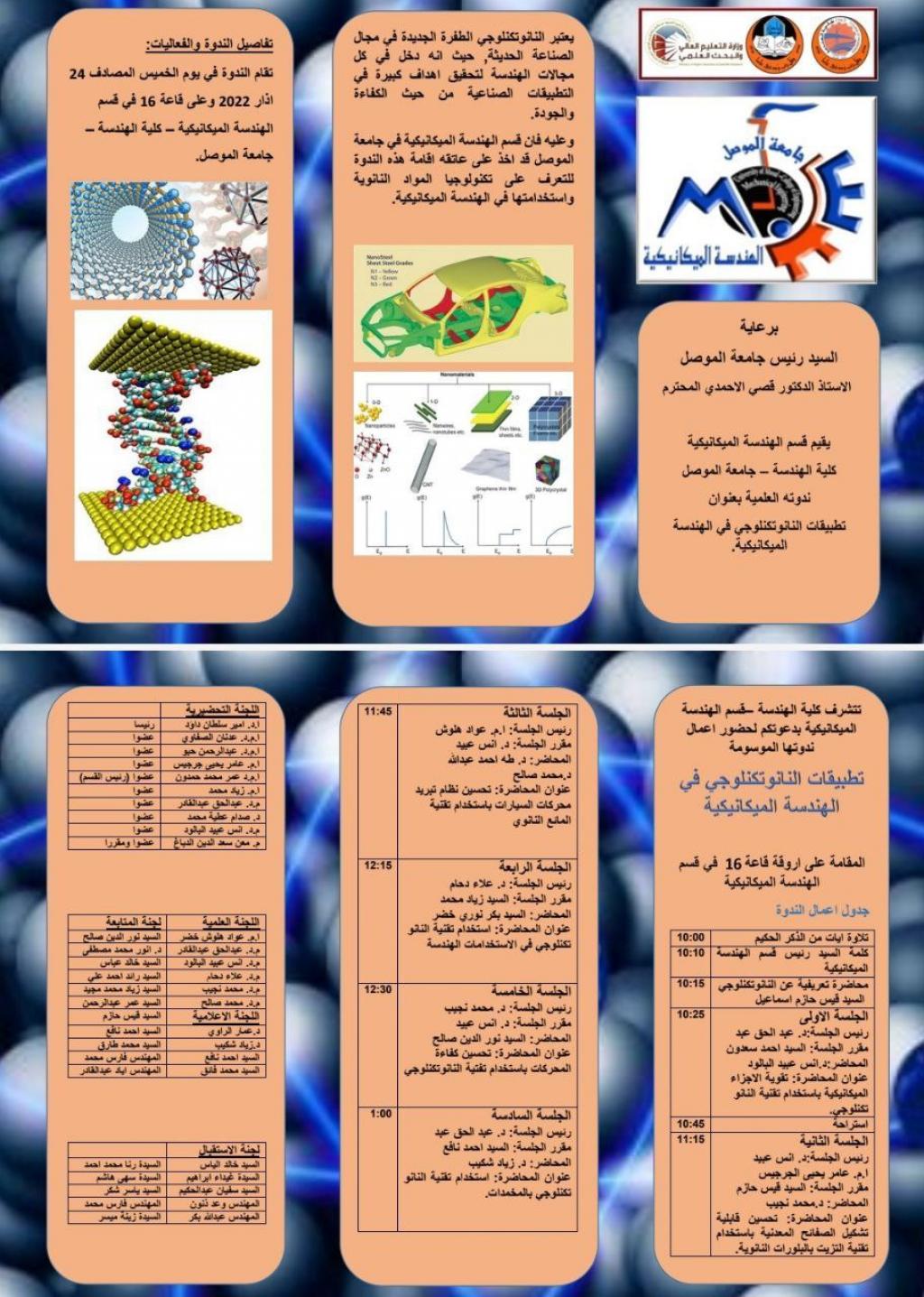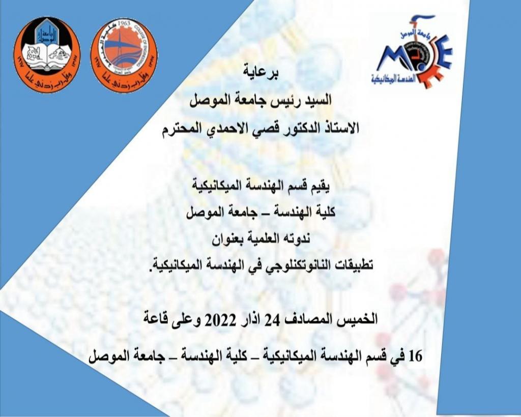 برعاية السيد رئيس جامعة الموصل المحترم الاستاذ الدكتور قصي الاحمدي وبحضور السيد عميد كلية الهندسة المحترم الاستاذ الدكتور بيار جعفر السليفاني والسادة المعاونين ورؤساء أقسام كلية الهندسة ومدير المكتب الاستشاري الهندسي لكلية الهندسة السيد عامر يحيى جرجيس المحترم، أقيمت في قسم الهندسة الميكانيكية وعلى قاعة 16 في يوم الخميس الموافق 24/3/2022 ندوة علمية بعنوان “تطبيقات النانو تكنولوجي في الهندسة الميكانيكية”.استخدمت تقنية النانو بشكل واسع في كثير من الصناعات الهندسية، ومن ضمنها تطبيقات الهندسة الميكانيكية نتيجة لما تتمتع به هذه المواد من صفات ميكانيكة وفيزيائية فريدة من نوعها، ادت إلى ثورة في مجال التطبيقات الهندسية المختلفة. تناولت الندوة استخدامات المواد النانوية لتحسين عمليات تشكيل المعادن وزيادة كفاءة سوائل التبريد بشكل خاص في محركات السيارات وزيادة كفاءة المخمدات الميكانيكية. اضافة إلى تحسين كفاءة المحركات عن طريق بعض التقنيات النانوية وتطبيقات أخرى متنوعة في مجال الهندسة الميكانيكية.