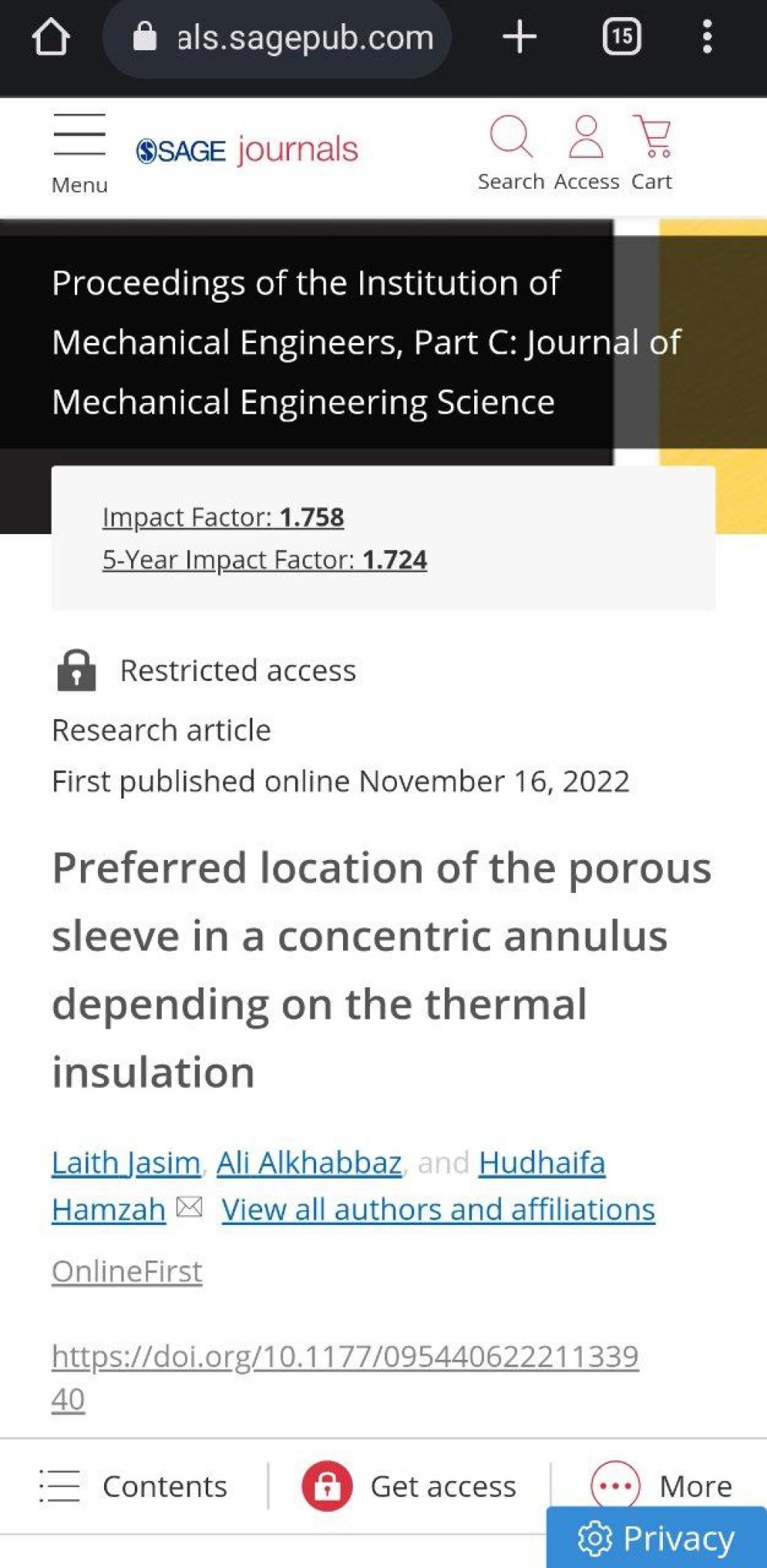 ضمن الانشطة العلمية المستمرة لأعضاء الهيئة التدريسية لقسم هندسة الميكاترونكس / كلية الهندسة / جامعة الموصل، تم نشر بحث جديد بإختصاص القوى الحرارية لتدريسي من قسم هندسة الميكاترونكس وهو د.ليث محمد جاسم بعنوان”Preferred location of the porous sleeve in a concentric annulus depending on the thermal insulation”في المجلة العالميةJournal of Mechanical Engineering Scienceوهي ضمن مستوعبات سكوبس العالمية ومن الربع الثاني، يذكر ان للدكتور العديد من البحوث المنشور في مجلات محلية وعالمية، مبارك للدكتور هذا الإنجاز والى المزيد من العطاء العلمي.
