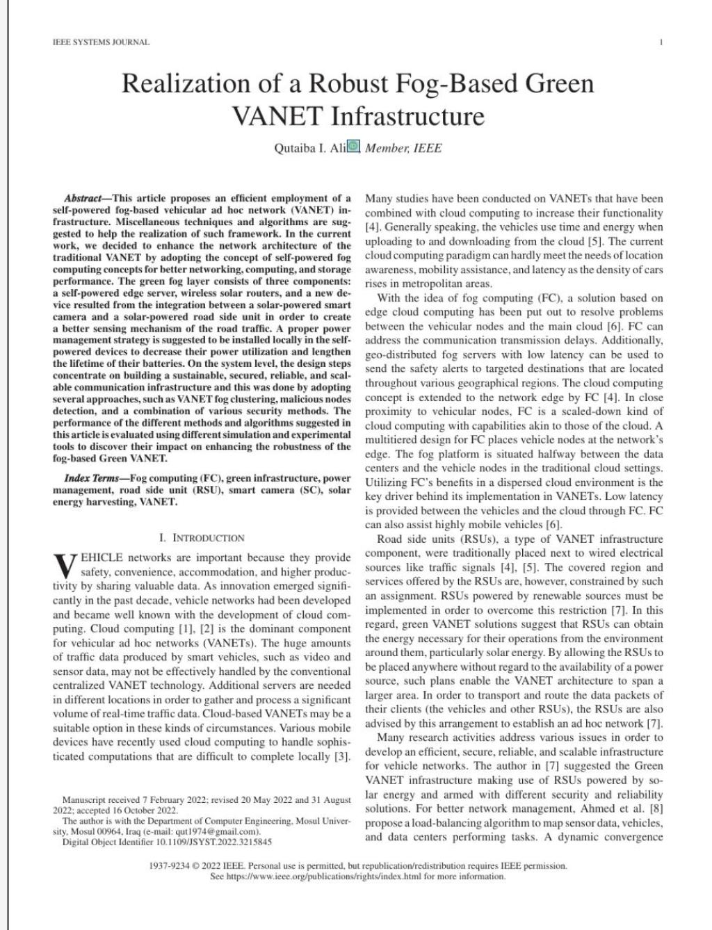 تنفيذاً لتوجيهات رئاسة جامعة الموصل بالنشر في المصنفات العالمية لتعزيز اسم ومكانة الجامعة العلمية، تم نشر بحث علمي بعنوان”Realization of a Robust Fog-Based Green VANETInfrastructure”للاستاذ الدكتور قتيبة ابراهيم علي، التدريسي في كلية الهندسة / قسم هندسة الحاسوب، في مجلة ذات معامل تأثير عالٍ و تقع ضمن قاعدة بيانات كلاريفت و كذلك في الربع الاول ضمن مستوعبات سكوبس و هي مجلة”IEEE Systems Journal”التي تصدر من مؤسسة IEEE العريقة.يتناول البحث تصميم و دراسة لبنية اتصالات ذاتية الطاقة (خضراء) لأنظمة التنقل الذكي مع تزويدها باجهزة استشعار مبتكرة.