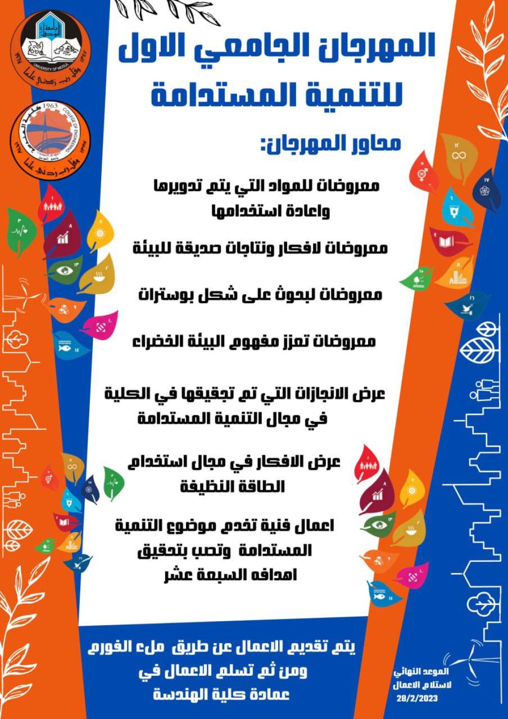 اقيم في كلية الهندسة في يوم الاربعاء الموافق 2023/2/8 في تمام الساعة الثامنة مساءا الورشة العلمية الالكترونية الموسومة “التنمية المستدامة في كلية الهندسة”.تضمنت الورشة جزئين حيث تم في الجزء الاول التعريف بمفهوم التنمية المستدامة والاستدامة بصورة خاصة ومن ثم التعريف باهداف التنمية المستدامة ومدى تحقيقها في كلية الهندسة اضافة الى وضع خطط مستقبلية في هذا المجال اما الجزء الثاني فتم فيه التعريف بمحاور المهرجان الجامعي الاول للتنمية المستدامة والذي سيقام على رحاب جامعة الموصل يوم الاربعاء الموافق 8/3/2023 وتم شرح آلية التقديم في المحاور المختلفة اضافة الى طريقة التقديم وتنظيم وترتيب الاعمال.حضر الورشة منتسبي كلية الهندسة اضافة الى د. صبا خير الدين ابراهيم / رئيس اللجنة الدائمة للتنمية المستدامة (مدير مركز بحوث البيئة) التي كان لها مداخلات بناءة خلال الورشة وتخللت الورشة محاورات ومناقشات بناءة وتمت الاجابة على تساولات واستفسارات الحضور .حاضر فيها كل من ممثل كلية الهندسة في اللجنة الدائمية للتنمية المستدامة في جامعة الموصل، اضافة الى اعضاء اللجنة التنظيمية في كلية الهندسة للمهرجان الجامعي الاول للتنمية المستدامة.