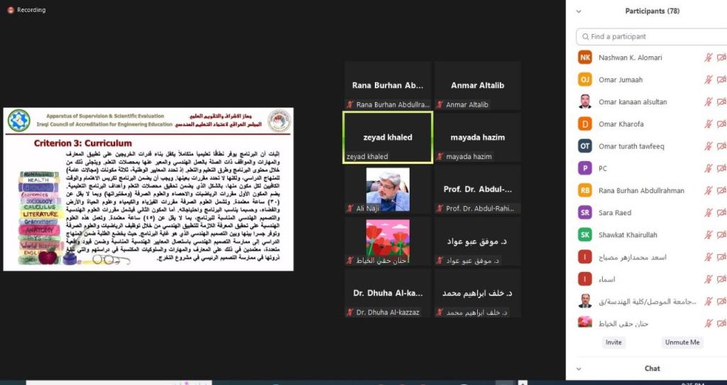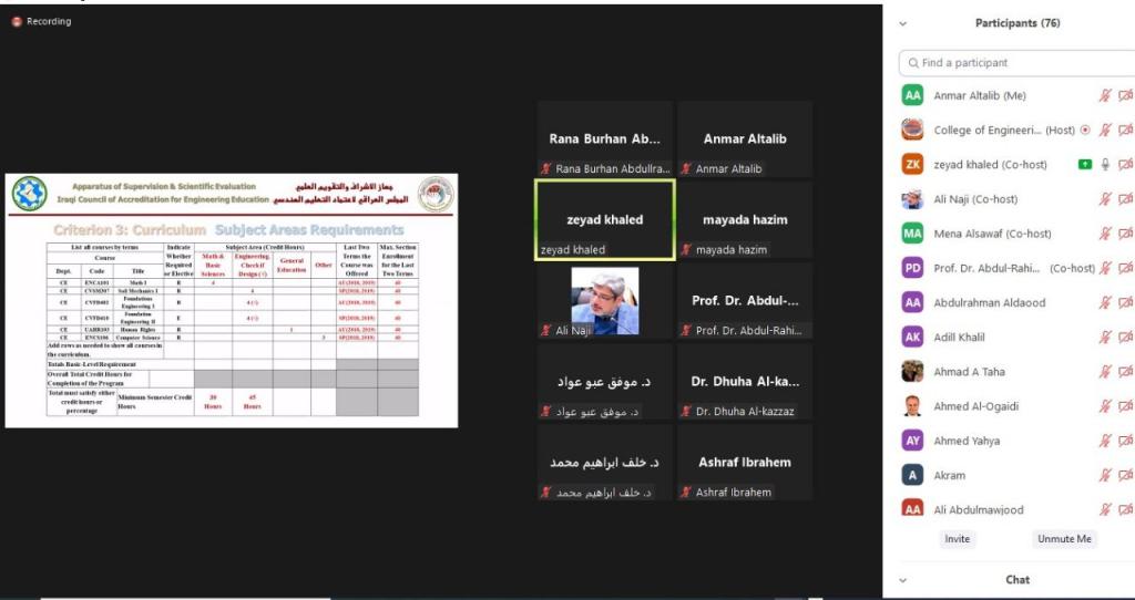 اقام الاستاذ الدكتور زياد سليمان محمد خالد، رئيس مجلس الاعتماد الاكاديمي الهندسي العراقي وعدد من أعضاء المجلس ورشة علمية الكترونية بعنوان “الاعتماد الاكاديمي الهندسي” في يوم السبت الموافق 29/10/2022 في الساعة الثامنة مساءا. تناولت ورشة العمل شرح عن الاعتماد البرامجي الهندسي وكيفية كتابة تقرير التقييم الذاتي الخاص بالاقسام العلمية بعد شرح المعايير التسعة الخاصة بالاعتماد البرامجي. اذ تناولت الورشة شرح مفصل لكل معيار وأسلوب وآلية كتابة تقرير التقييم الذاتي والذي يعتبر خطوة اولى ومهمة للحصول على الاعتمادية. اختتمت الورشة بمناقشة واسعة بين السادة المحاضريين واعضاء لجان الاعتماد البرامجي في اقسام كلية الهندسة للإجابة عن تساولات أعضاء لجان الاعتماد الهندسي في أقسام كلية الهندسة.