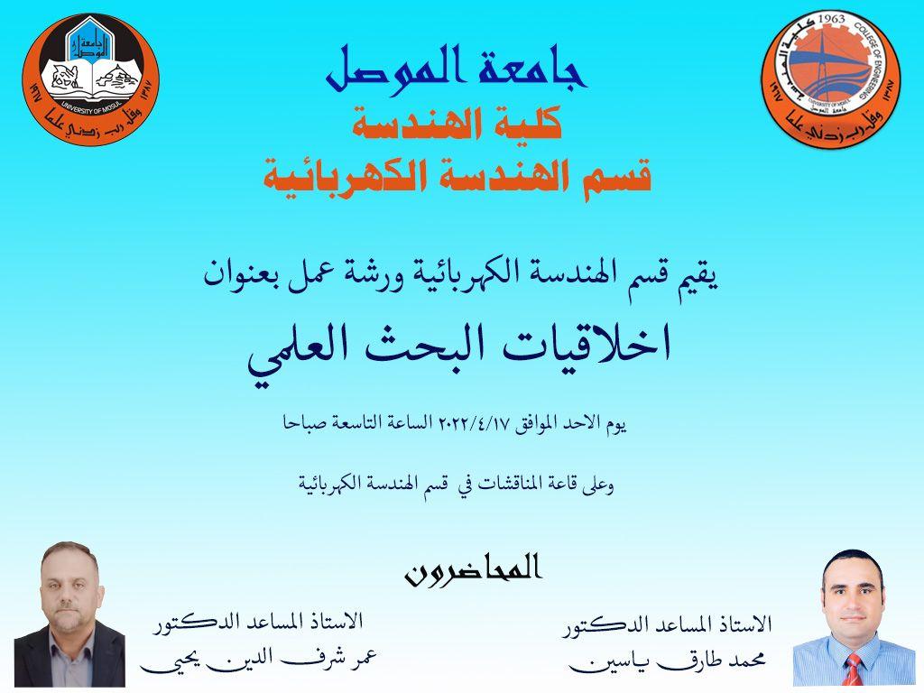 ضمن النشاطات العلمية لقسم الهندسة الكهربائية، اقام السيد رئيس قسم الهندسة الكهربائية أ.م.د محمد طارق ياسين وأ.م.د عمر شرف الدين يحيى ورشة عمل بعنوان “اخلاقيات البحث العلمي” في يوم الاحد الموافق 17-4-2022.