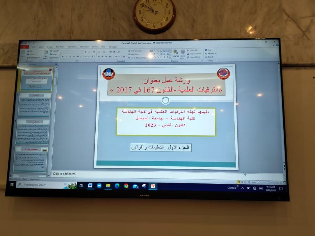 اقامت اللجنة الفرعية للترقيات العلمية في كلية الهندسة ورشة عمل بعنوان “قوانين الترقيات العلمية” وذلك في الساعة التاسعة والنصف صباحا من يوم الخميس الموافق 12/1/2023وعلى قاعة الدكتور المرحوم نجيب خروفة في قسم الهندسة المدنية.تناولت الورشة شرح مفصل لمتطلبات الترقية العلمية من قبل التدريسيين، والية تفصيل وادراج المتطلبات في المعاملة، وتوضيح لجميع الفقرات، وذكر لاهم التفصيلات التي اشارت لها اللجنة المركزية. وفي الختام، تمت الاجابة على العديد من التساؤلات التي طرحت.