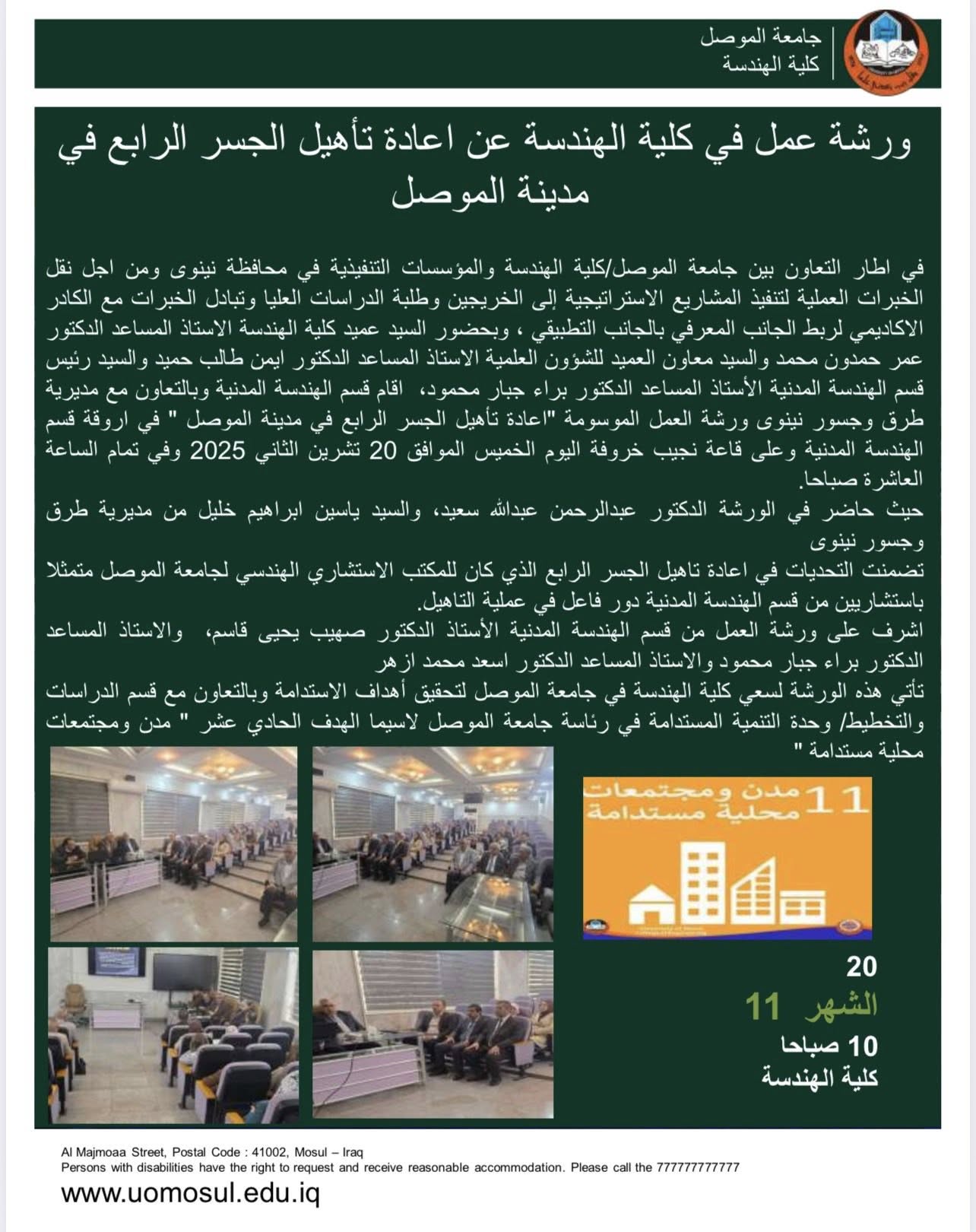 في اطار التعاون بين جامعة الموصل/كلية الهندسة والمؤسسات التنفيذية في محافظة نينوى ومن اجل نقل الخبرات العملية لتنفيذ المشاريع الاستراتيجية إلى الخريجين وطلبة الدراسات العليا [إقرأ المزيد]