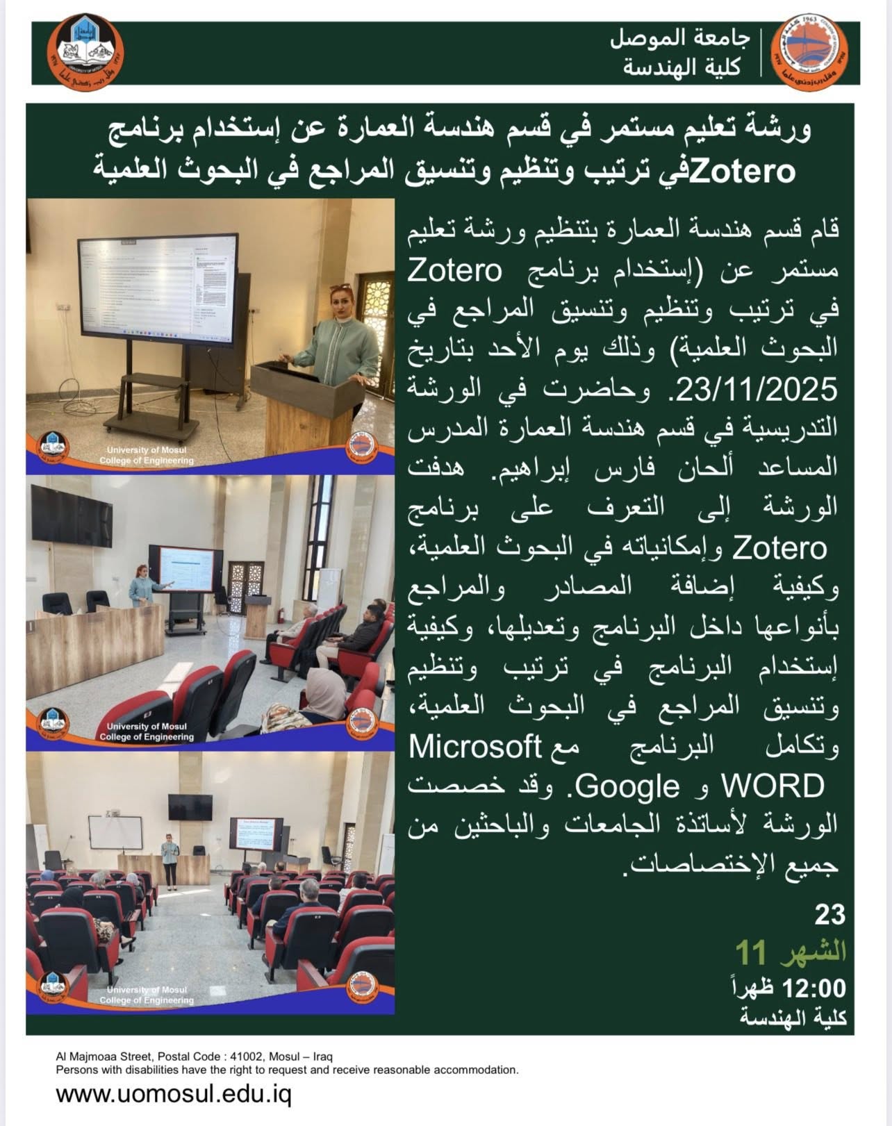 أقام قسم هندسة العمارة في كلية الهندسة بتنظيم ورشة تعليم مستمر عن (إستخدام برنامج Zotero في ترتيب وتنظيم وتنسيق المراجع في البحوث العلمية) وذلك يوم [إقرأ المزيد]