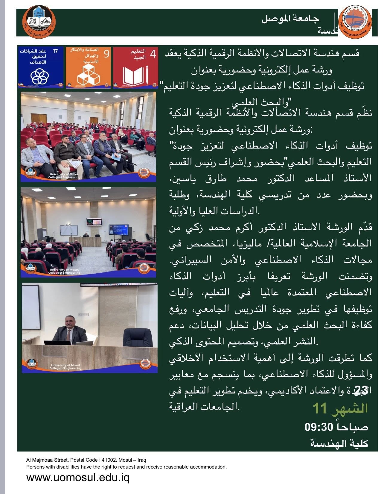 ضمن النشاطات العلمية لكلية الهندسة بجامعة الموصل، أقام قسم هندسة الاتصالات والأنظمة الرقمية الذكية وبالتعاون مع قسم الدراسات والتخطيط / وحدة التنمية المستدامة في رئاسة [إقرأ المزيد]