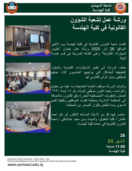 اقامت شعبة الشؤون القانونية في كلية الهندسة يوم الاثنين الموافق 26 أيار 2025 ورشة عمل بعنوان “تطوير المهارات القانونية" وعلى القاعة المدرجة في قسم هندسة [إقرأ المزيد]