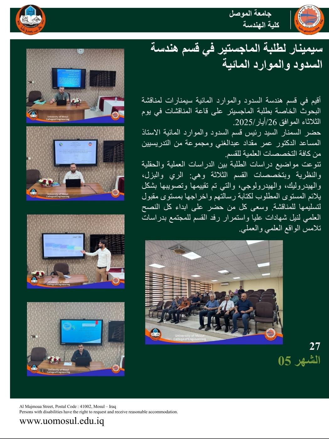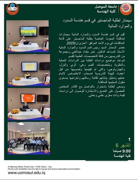 أقام قسم هندسة السدود والموارد المائية / كلية الهندسة بجامعة الموصل سمينار لمناقشة طالب الدراسات العليا (احمد محمد سعدي) حول (التحري المختبري للجريان فوق الهدار [إقرأ المزيد]