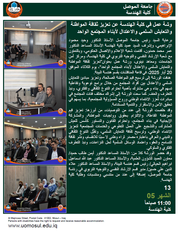 أقامت شعبة الارشاد النفسي الجامعي في كلية الهندسة بالتعاون مع قسم الارشاد النفسي الجامعي في رئاسة جامعة الموصل يوم الاثنين الموافق 6 تشرين الاول 2025 [إقرأ المزيد]