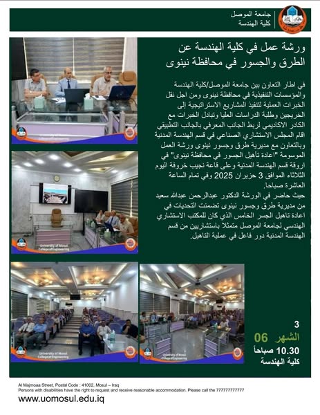 في اطار التعاون بين جامعة الموصل/كلية الهندسة والمؤسسات التنفيذية في محافظة نينوى ومن اجل نقل الخبرات العملية لتنفيذ المشاريع الاستراتيجية إلى الخريجين وطلبة الدراسات العليا [إقرأ المزيد]