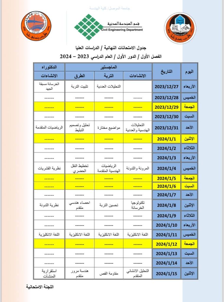 تفقد السيد مساعد رئيس جامعة الموصل للشؤون العلمية، الاستاذ الدكتور منير سالم طه، القاعات الامتحانية لقسم الهندسة المدنية في كلية الهندسة، يوم السبت الموافق 2023/12/23 لمتابعة سير الامتحانات النهائية لطلبة الدراسات الأولية/ الفصل الاول (الفصل الخريفي)، وإطلع سيادته على طبيعة الأسئلة وسير العملية الإمتحانية في الكلية.