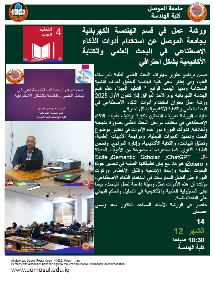 ضمن برنامج تطوير مهارات البحث العلمي لطلبة الدراسات العليا الذي اعدته وزارة التعليم العالي والبحث العلمي- دائرة البحث والتطوير أقيمت ورشة حضورية على قاعة الدكتور نجيب خروفه في كلية الهندسة – قسم الهندسة المدنية يوم الاحد الموافق 2024/4/21 بعنوان “استخدام برنامج Mendeley لإدارة وترتيب المراجع”