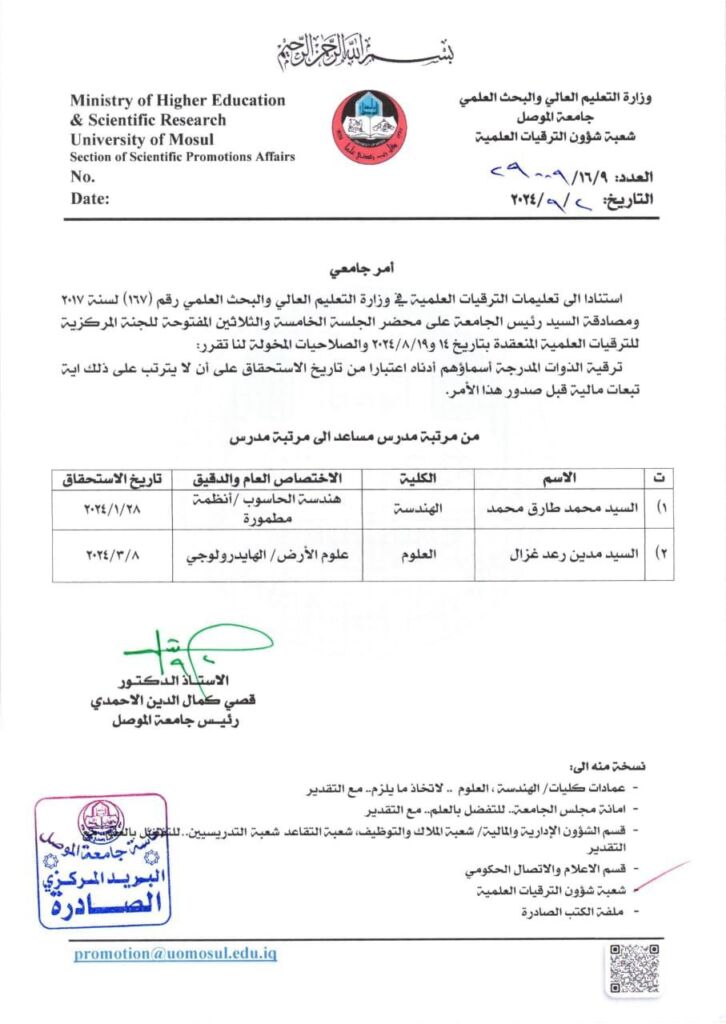 نظراً لقبول المدرس المساعد عمار شامل غانم التدريسي في قسم الهندسة الكهربائية في كليتنا والمكلف بمهام مسؤول شعبة شؤون الطلبة والتسجيل في الدراسات العليا للحصول على شهادة الدكتوراه، تقرر انهاء تكليفه لاتاحة الفرصة الكافية له للدراسة وتكليف الدكتور حسين محمود محمد التدريسي في قسم هندسة الحاسوب بمهام مسؤول شعبة شؤون الطلبة والتسجيل.