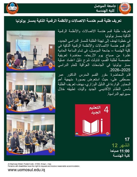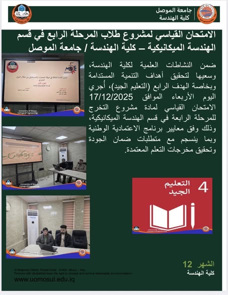 اجتمعت الهيئة العامة لقسم هندسة العمارة يوم الثلاثاء الموافق 24 /12 /2024 برئاسة السيد رئيس القسم الاستاذ المساعد الدكتور عمر حازم خروفة. تناول الاجتماع ابرز ماجاء من توجيهات السيد رئيس جامعة الموصل الاستاذ الدكتور وحيد محمود الابراهيمي لمجلس كلية الهندسة والتي اكد فيها على: