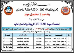 ناقشت كلية الهندسة / قسم الهندسة الكهربائية بجامعة الموصل رسالة ماجستير عن ” إستقصاء أداء نبيطة GaN-HEMT في بيئة درجات الحرارة العالية ” ، يوم الخميس الموافق 26 /12 /2024.