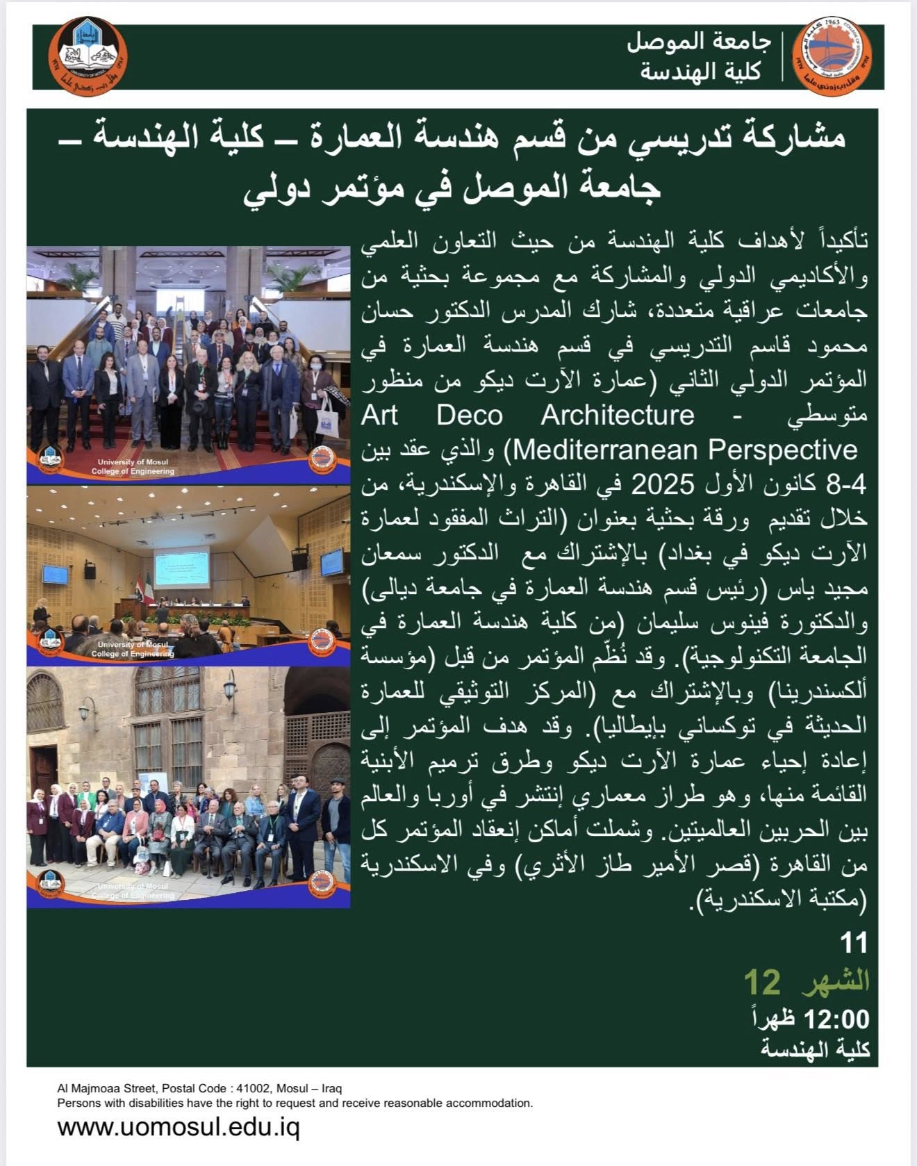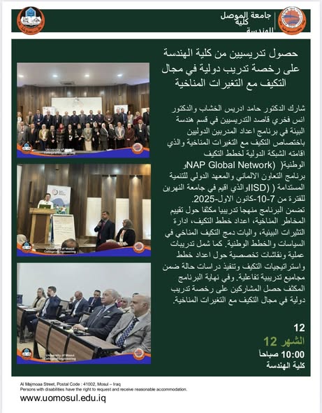 ضمن الأنشطة العلمية المستمرة لاعضاء الهيئة التدريسية لقسم هندسة الطاقة المستدامة/كلية الهندسة/جامعة الموصل، نشر المدرس الدكتور علي عزام محمد بحث علمي جديد ضمن مواضيع الطاقات المتجددة والمستدامة بعنوان ( ‏Integrated CFD and hydrodynamic correction approach for load response analysis of floating offshore wind turbine ) في مجلة Ocean Engineering وهي من المجلات العلمية الرصينة والتي تقع ضمن الربع الأول وضمن قاعدة بيانات سكوبس وكلاريفيت وبمعامل تأثير (IF=4.6) .