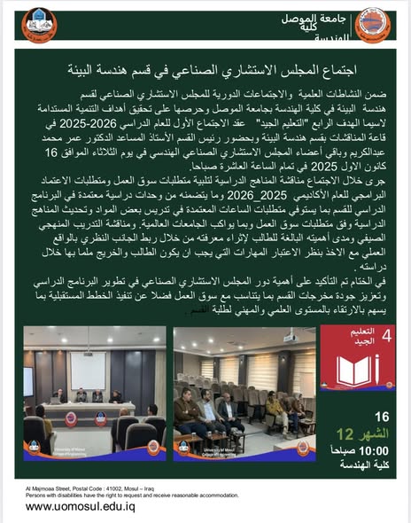 ناقشت كلية الهندسة / قسم الهندسة الميكانيكية بجامعة الموصل رسالة الماجستير الموسومة ” تحسين أداء وحدات توربينية غازية مركبة من خلال التصميم الأمثل لمنظومات توليد البخار”، عند الساعة التاسعة صباحا من يوم الاثنين الموافق 7 /4 /2025
