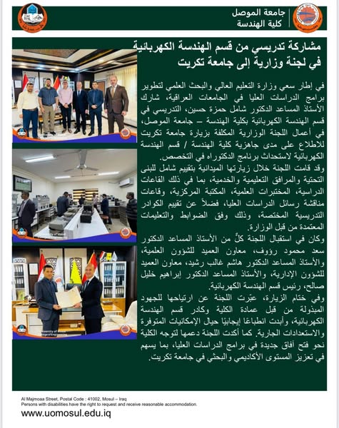 مشاركة تدريسي من قسم الهندسة الكهربائية في لجنة وزارية إلى جامعة تكريت