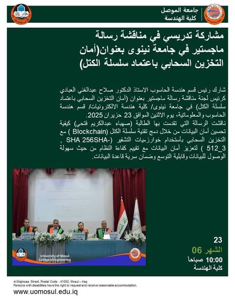 شارك التدريسي في قسم هندسة الحاسوب الاستاذ الدكتور شفاء عبدالرحمن داؤد في مناقشة رسالة ماجستير في جامعة نينوى/كلية هندسة الالكترونيات/ قسم هندسة الحاسوب والمعلوماتية يوم الخميس الموافق 19حزيران 2025 للطالبة (زهراء احمد زهير) بعنوان (الحوسبة التقريبية لمعالجات ARM خفيف الوزن).