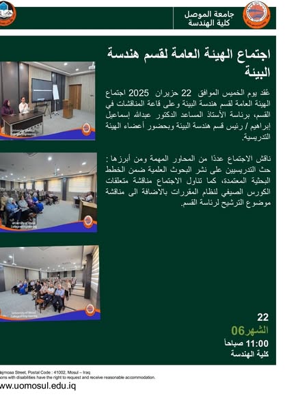 أُقيمت يوم الأحد الموافق 22 حزيران 2025، على قاعة المناقشات في قسم الهندسة الميكانيكية – كلية الهندسة، دورة تدريبية تحت عنوان “تعزيز ثقافة المشاركة في عملية اتخاذ القرار الهندسي”، والتي تستمر حتى السادس والعشرين من الشهر الجاري.