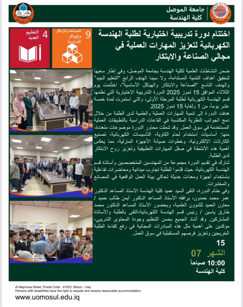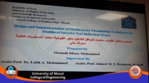 ضمن النشاطات العلمية لكلية الهندسة بجامعة الموصل، وفي إطار سعيها لتحقيق أهداف التنمية المستدامة، ولا سيما الهدف السابع عشر “عقد الشراكات لتحقيق الاهداف ”، وضمن اطار تعزيز التعاون العلمي بين الجامعات وتبادل الخبرات والمعرفة بين التدريسيين والباحثين في مجالات الهندسة المختلفة شارك الاستاذ المساعد الدكتور ياسر محمد يونس بصفته عضوا في لجنة مناقشة رسالة الماجستير التقني تخصص هندسة تقنيات القدرة الكهربائية والموسومة:- “تصميم وتنفيذ تقنيات متعددة النواقل لتشغيل مغير الفولتية متعدد المستويات لتغذية محرك حثي”.
