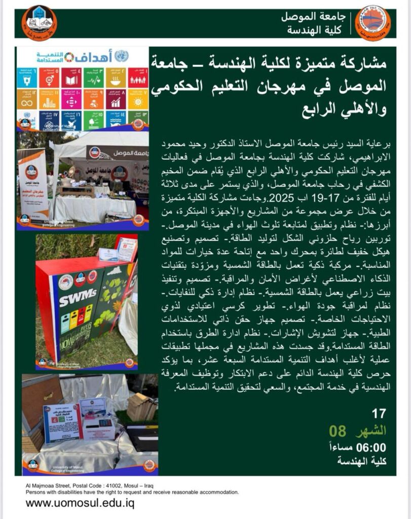ضمن النشاطات العلمية لكلية الهندسة في جامعة الموصل، وحرصًا منها على تحقيق أهداف التنمية المستدامة ولاسيما الهدف الرابع “التعليم الجيد” والهدف التاسع “الصناعة والابتكار والهياكل الأساسية”، نُشر بحث علمي جديد في اختصاص الهندسة الكهربائية للأستاذ المساعد الدكتور عمر شرف الدين يحيى اليوزبكي وبالتعاون مع طالب الماجستير مصطفى ثائر نوري الجمال، بتاريخ 10 آب 2025، بعنوان ”