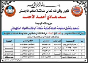 هدفت الرسالة التي تقدم بها الطالب ” سعد هادي احمد” الى ” تصميم نظام حماية ذكي متعدد الوظائف للمولد الكهربائي يعتمد على نقطة التشغيل داخل منحنى القدرة P-Q للمولدات المتزامنة، باستخدام MATLAB/Simulink ونظام الاستدلال الضبابي (FIS)”.