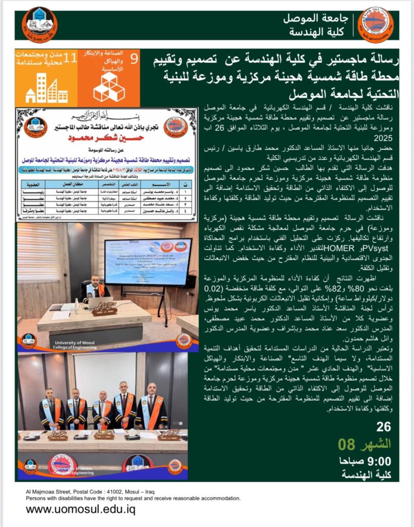 ناقشت كلية الهندسة / قسم الهندسة الكهربائية بجامعة الموصل رسالة ماجستير عن ” عنوان تصميم مرحلة حماية المسافة الضبابية متضمنة خطة لتجنب تأرجح القدرة الكهربائية “، يوم الاثنين الموافق 25 اب 2025 .