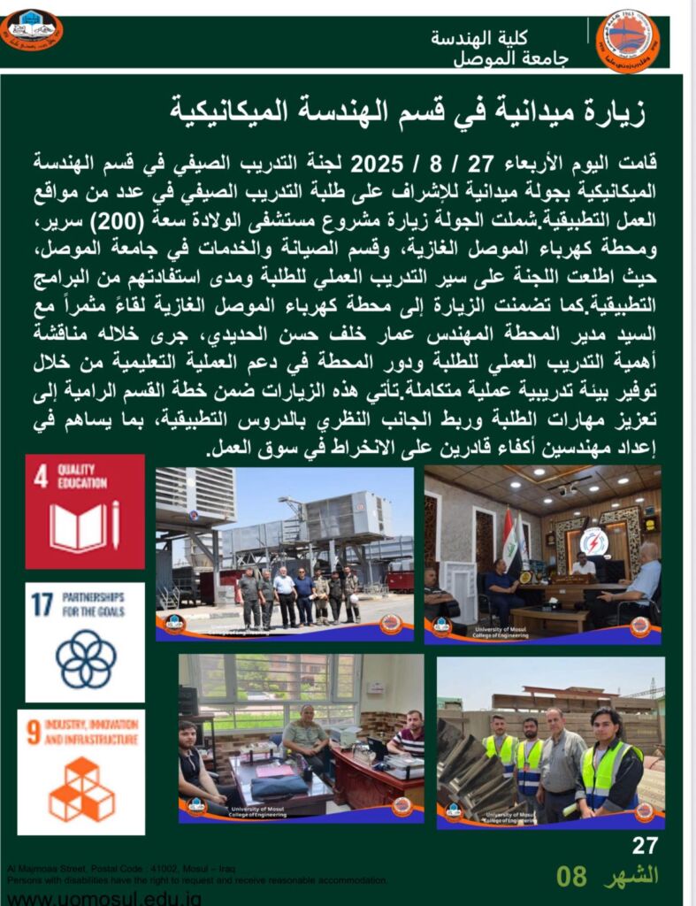 ناقشت كلية الهندسة / قسم الهندسة الكهربائية بجامعة الموصل رسالة ماجستير عن تصميم نظام مراقبة ذكي لكشف وتشخيص الأعطال الكهربائية المبكرة في محولة قدرة ثلاثية الطور ، يوم الأربعاء الموافق 27 اب 2025.