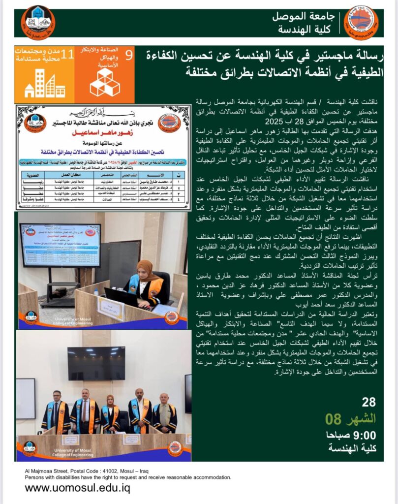 ناقشت كلية الهندسة / قسم الهندسة الكهربائية بجامعة الموصل رسالة ماجستير عن تصميم نظام ذكي لكشف وتحديد أنواع الأعطال في مزارع أنظمة الطاقة الشمسية ، يوم الخميس الموافق 28 اب 2025.