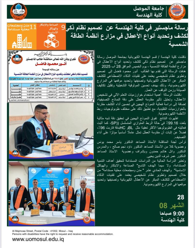 ناقشت كلية الهندسة / قسم الهندسة الكهربائية بجامعة الموصل رسالة ماجستير عن تحسين الكفاءة الطيفية في أنظمة الاتصالات بطرائق مختلفة، يوم الخميس الموافق 28 اب 2025 .