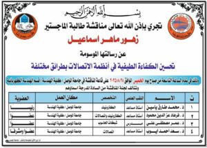 ناقشت كلية الهندسة / قسم الهندسة الكهربائية بجامعة الموصل رسالة ماجستير عن تحسين الكفاءة الطيفية في أنظمة الاتصالات بطرائق مختلفة، يوم الخميس الموافق 28 اب 2025 .
