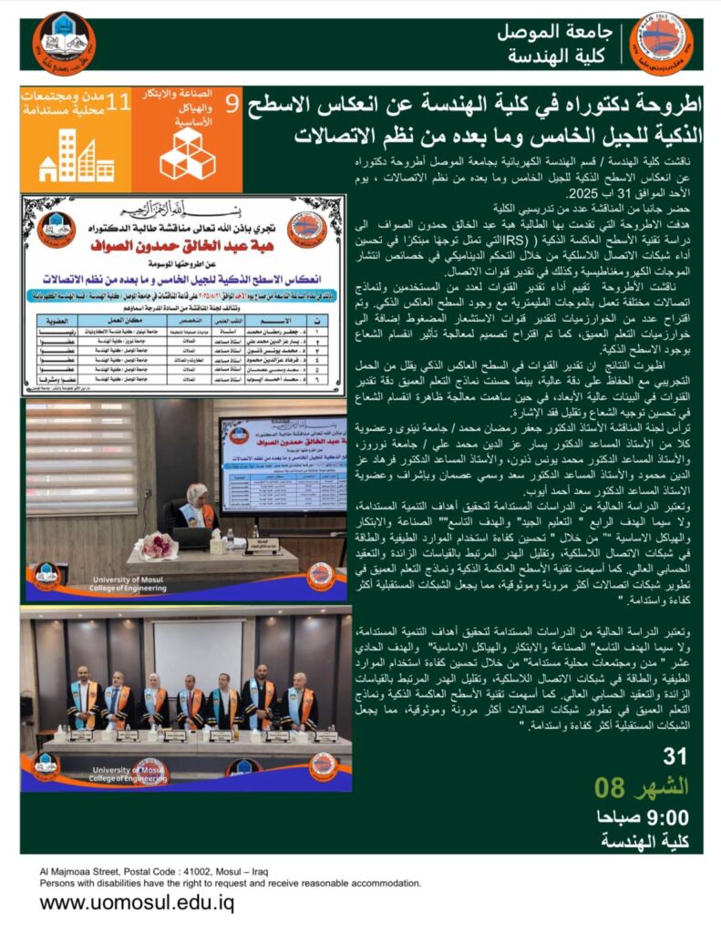 ناقشت كلية الهندسة / قسم الهندسة الكهربائية بجامعة الموصل أطروحة دكتوراه عن ” التصميم والاداء الامثل لنبائط اشباه الموصلات ذات ثابت العزل العالي للتطبيقات المتقدمة ” يوم الأحد الموافق 31 اب 2025.